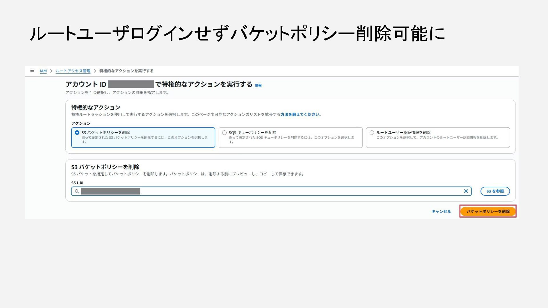 ルートユーザログインせずバケットポリシー削除可能に
