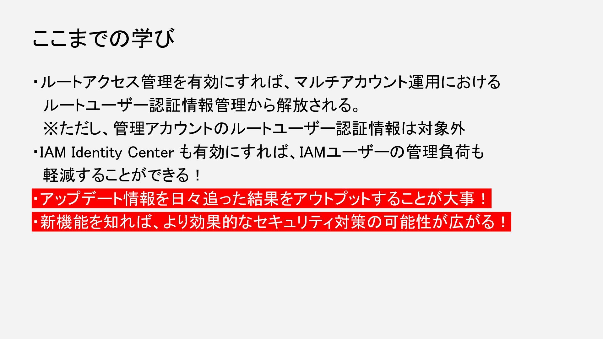 ・ルートアクセス管理を有効にすれば、マルチアカウント運用における ルートユーザー認証情報管理から解放される。 ※ただし、管理アカウントのルートユーザー認証情報は対象外 ・IAM Identity Center も有効にすれば、IAMユーザーの管理負荷も 軽減することができる! ・アップデート情報を日々追った結果をアウトプットすることが大事! ・新機能を知れば、より効果的なセキュリティ対策の可能性が広がる!