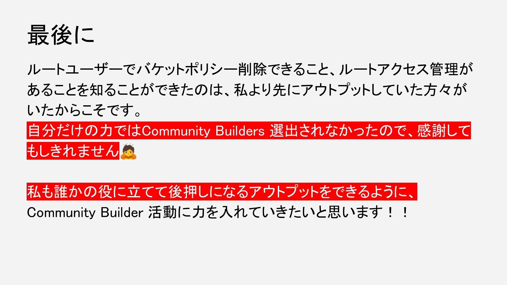 ルートユーザーでバケットポリシー削除できること、ルートアクセス管理が あることを知ることができたのは、私より先にアウトプットしていた方々が いたからこそです。 自分だけの力ではCommunity Builders 選出されなかったので、感謝して もしきれません🙇 私も誰かの役に立てて後押しになるアウトプットをできるように、 Community Builder