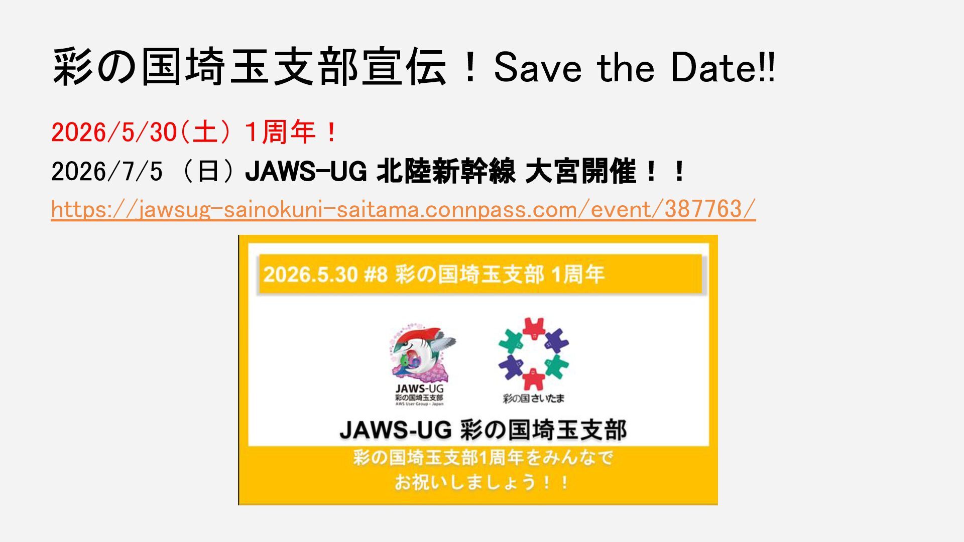 彩の国埼玉支部宣伝!Save the Date!! 2026/5/30(土) 1周年! 2026/7/5 (日) JAWS-UG 北陸新幹線 大宮開催!!