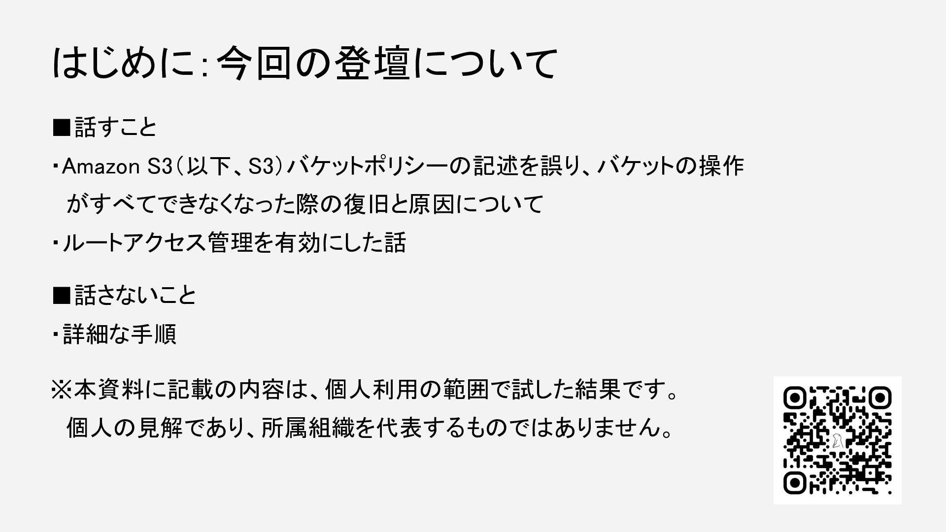 ▪話すこと ・Amazon S3(以下、S3)バケットポリシーの記述を誤り、バケットの操作 がすべてできなくなった際の復旧と原因について ・ルートアクセス管理を有効にした話 ▪話さないこと ・詳細な手順 ※本資料に記載の内容は、個人利用の範囲で試した結果です。 個人の見解であり、所属組織を代表するものではありません。 はじめに:今回の登壇について