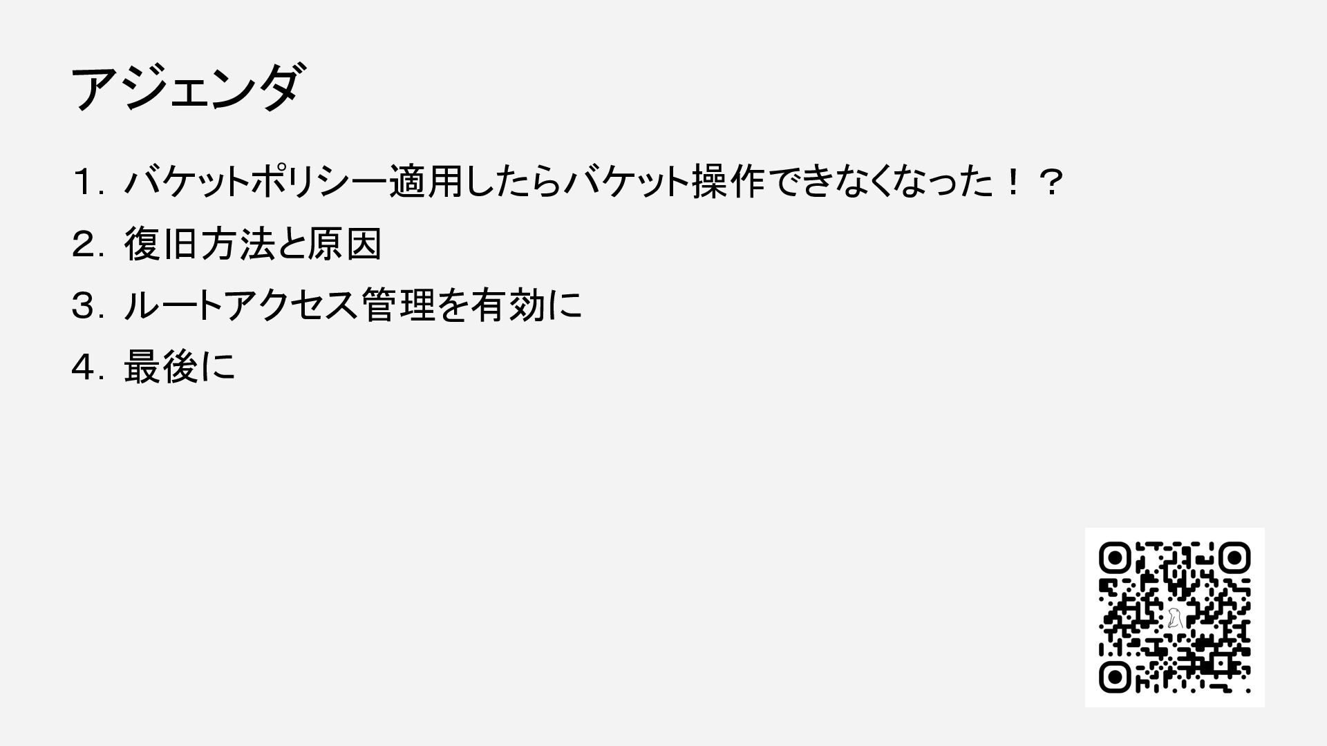 1.バケットポリシー適用したらバケット操作できなくなった!? 2.復旧方法と原因 3.ルートアクセス管理を有効に 4.最後に アジェンダ