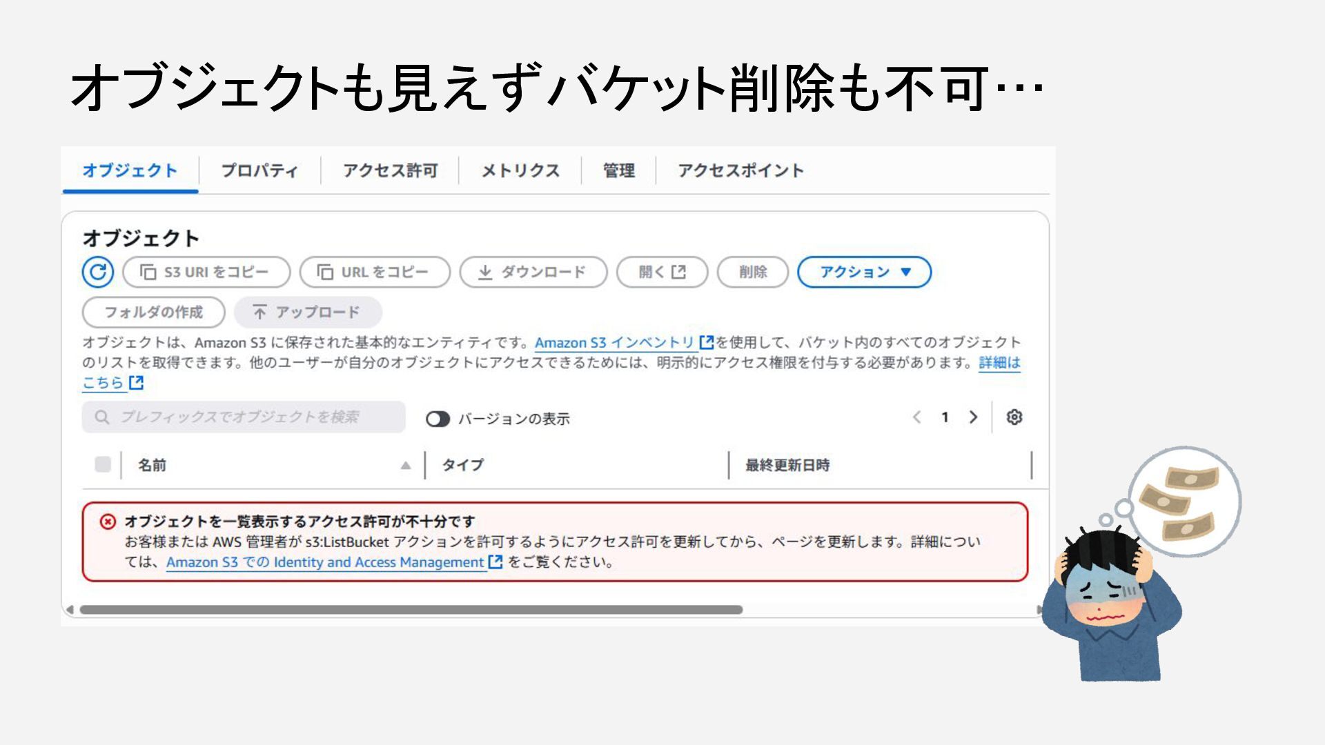 オブジェクトも見えずバケット削除も不可…