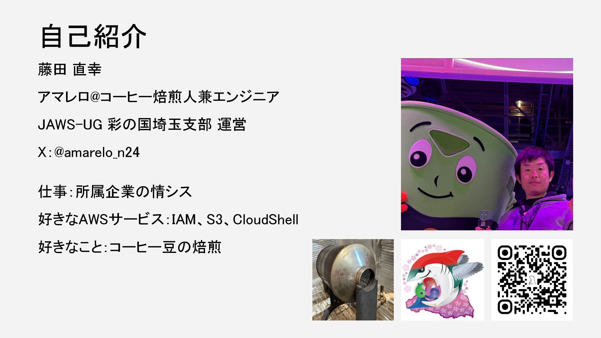 自己紹介 藤田 直幸 アマレロ@コーヒー焙煎人兼エンジニア JAWS-UG 彩の国埼玉支部 運営 X:@amarelo_n24 仕事:所属企業の情シス