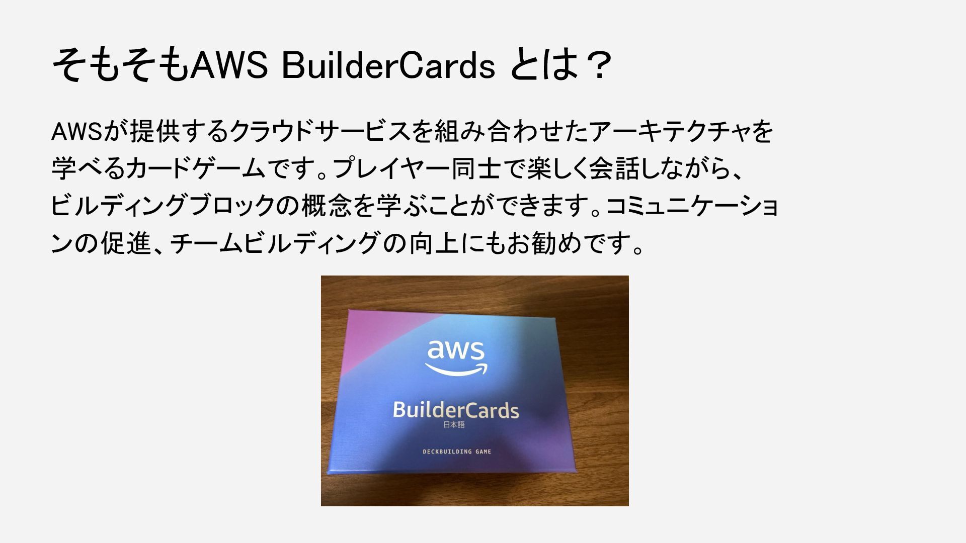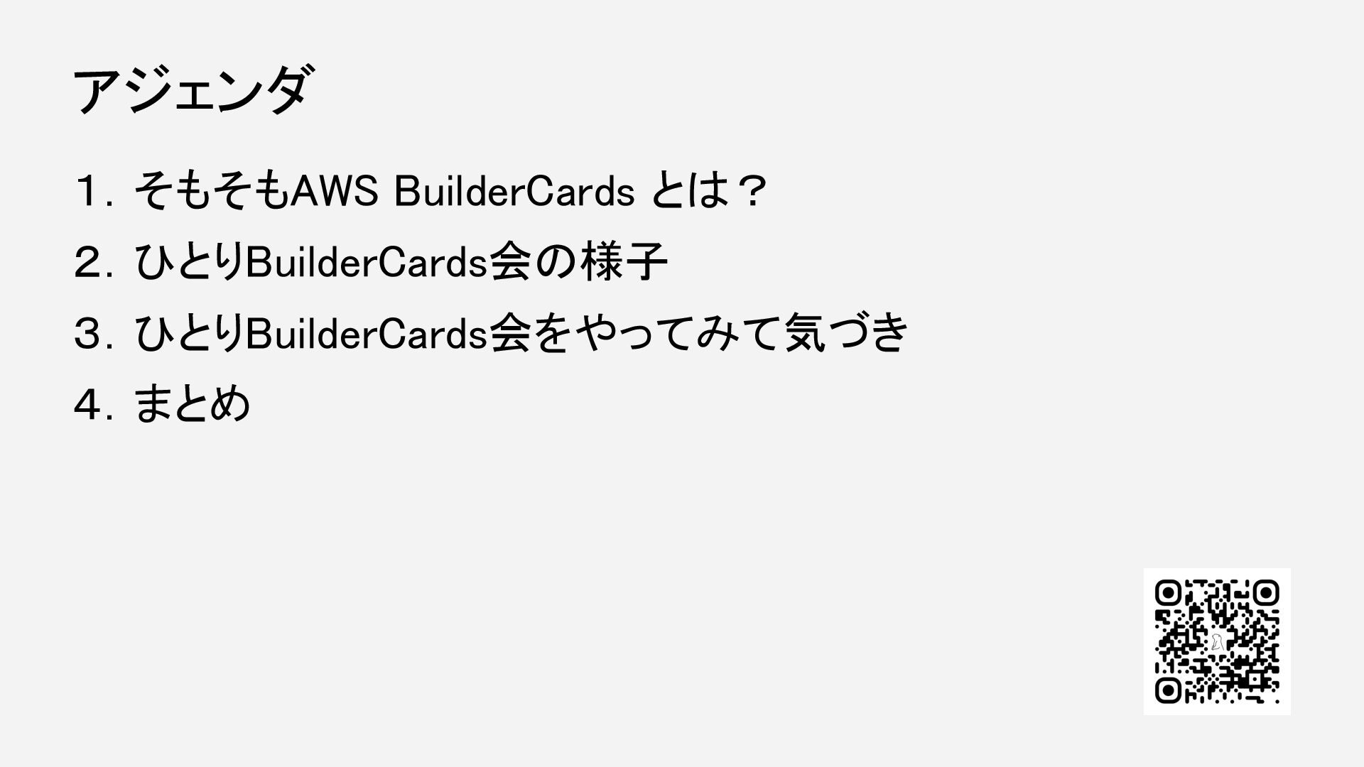 1.そもそもAWS BuilderCards とは? 2.ひとりBuilderCards会の様子 3.ひとりBuilderCards会をやってみて気づき 4.まとめ アジェンダ