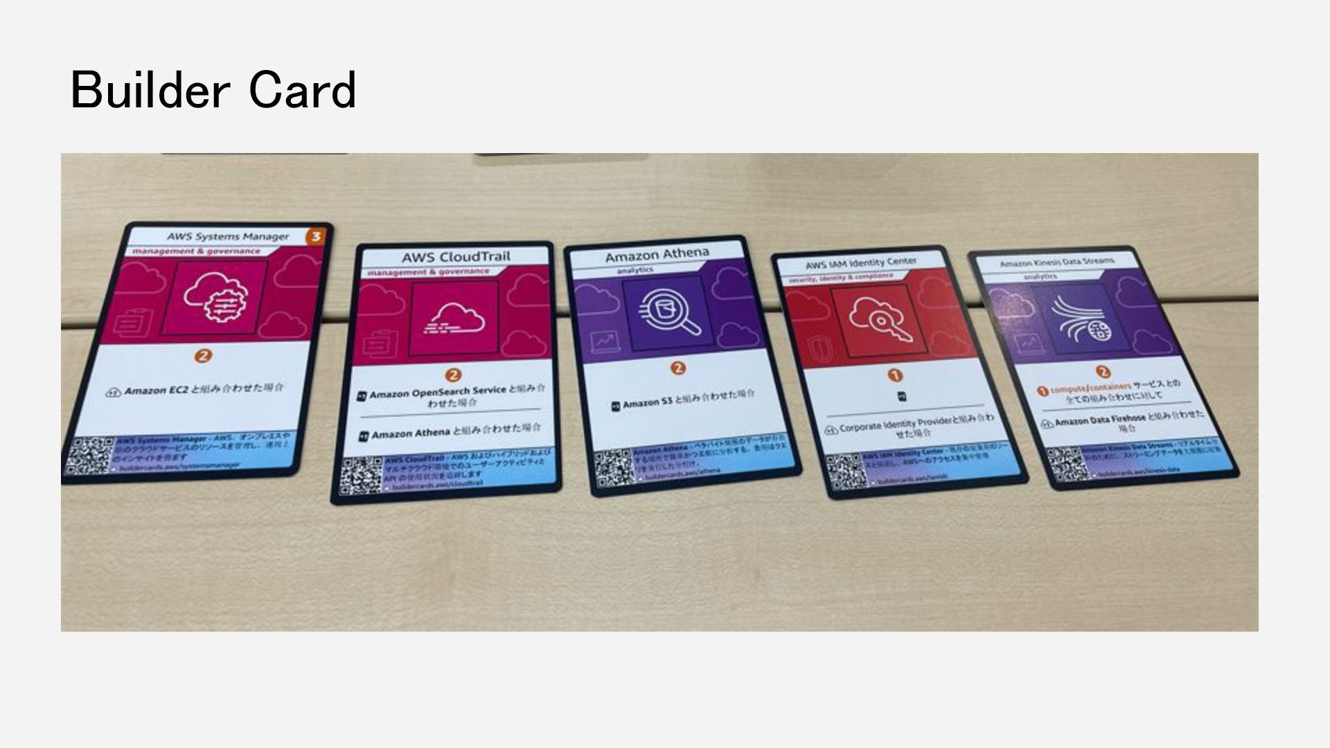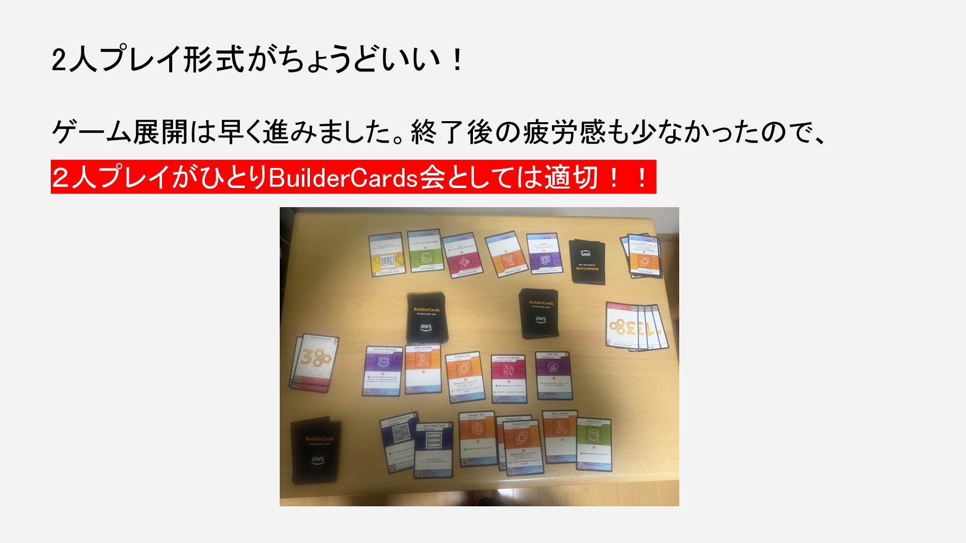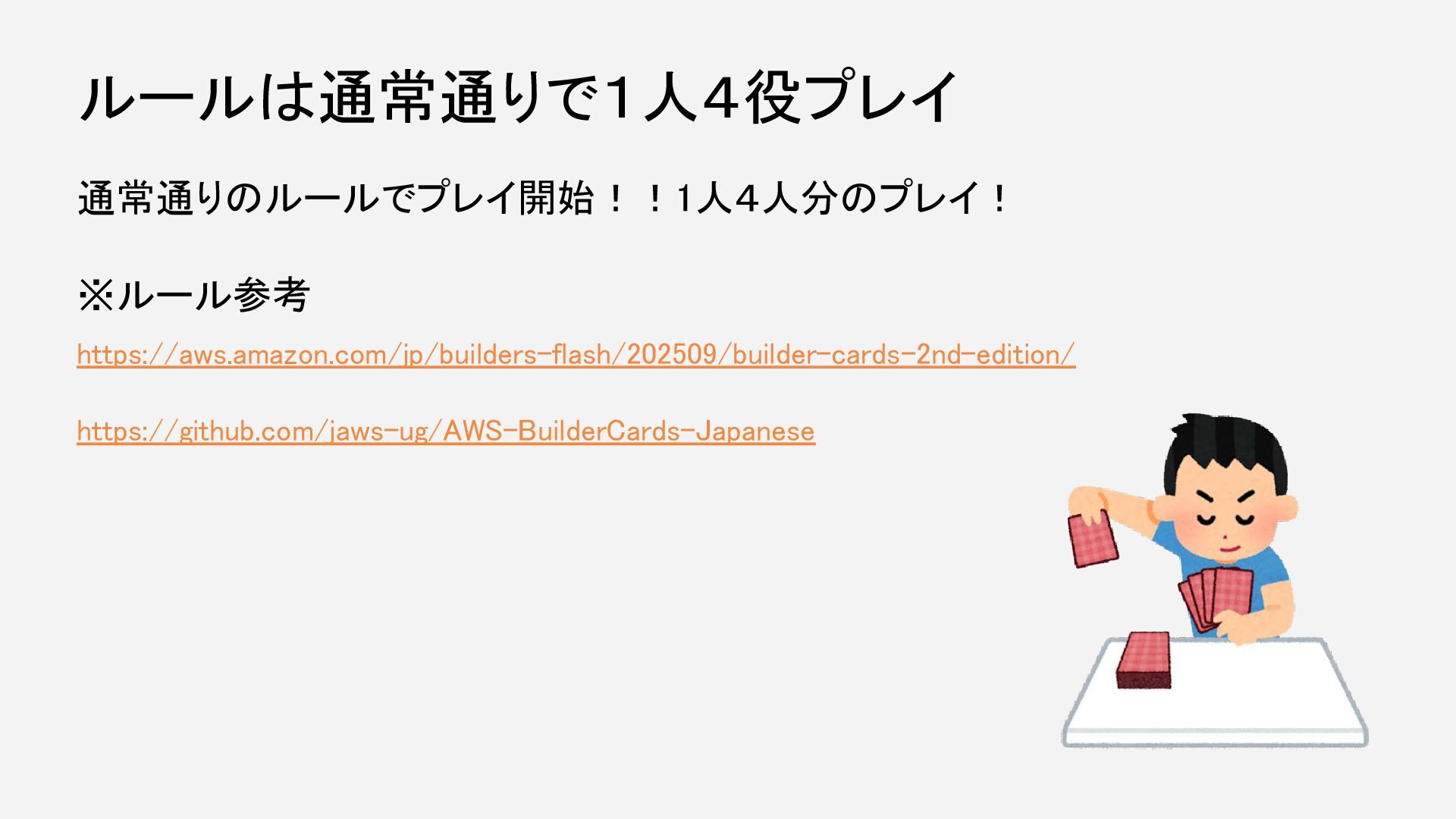 ・BuilderCardsのルールを覚えて円滑なプレイと議論ができるよう、 ひとりAWS BuilderCards会はおすすめです! ・BuilderCardsのセットを持っているけどプレイできずにいる方は、 一度1人でもやってみてはいかがでしょうか? ・自分だけのBuilderCardsの楽しさなどに気づくかもしれません。 ・ただし、寂しさには耐えましょうw ・ひとりではなく、一緒にプレイできる仲間と場所を作りたい。 まとめ