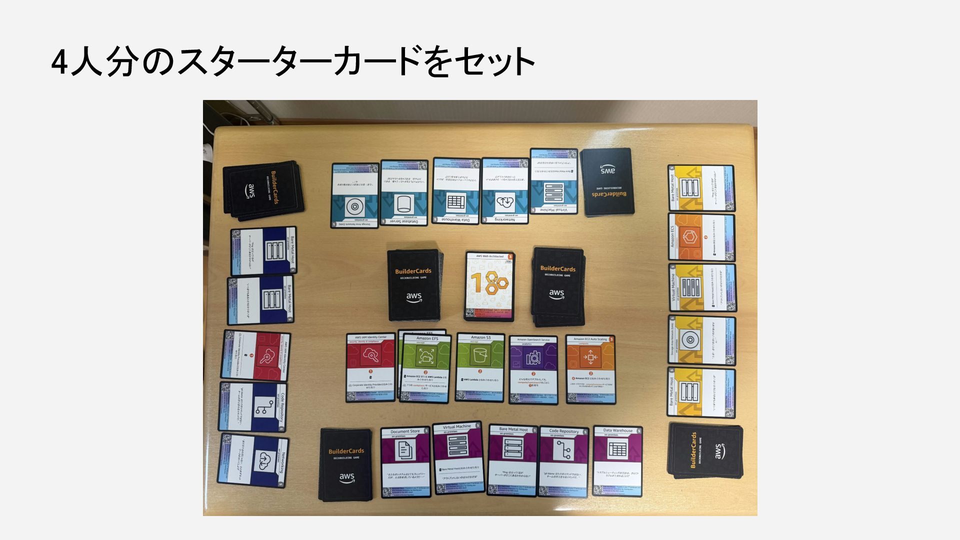 通常通りのルールでプレイ開始!!1人4人分のプレイ! ※ルール参考 https://aws.amazon.com/jp/builders-flash/202509/builder-cards-2nd-edition/ https://github.com/jaws-ug/AWS-BuilderCards-Japanese ルールは通常通りで1人4役プレイ