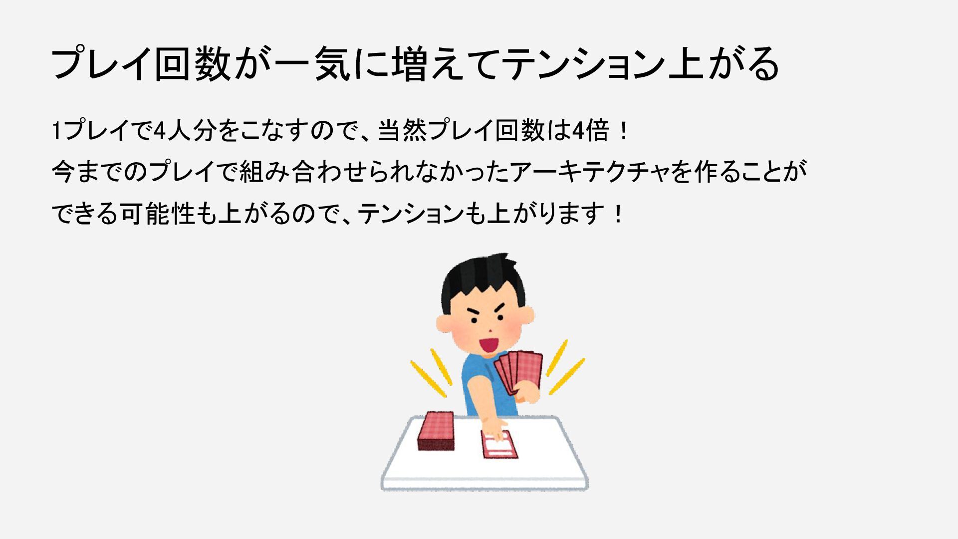 1プレイで4人分をこなすので、当然プレイ回数は4倍! 今までのプレイで組み合わせられなかったアーキテクチャを作ることが できる可能性も上がるので、テンションも上がります! プレイ回数が一気に増えてテンション上がる