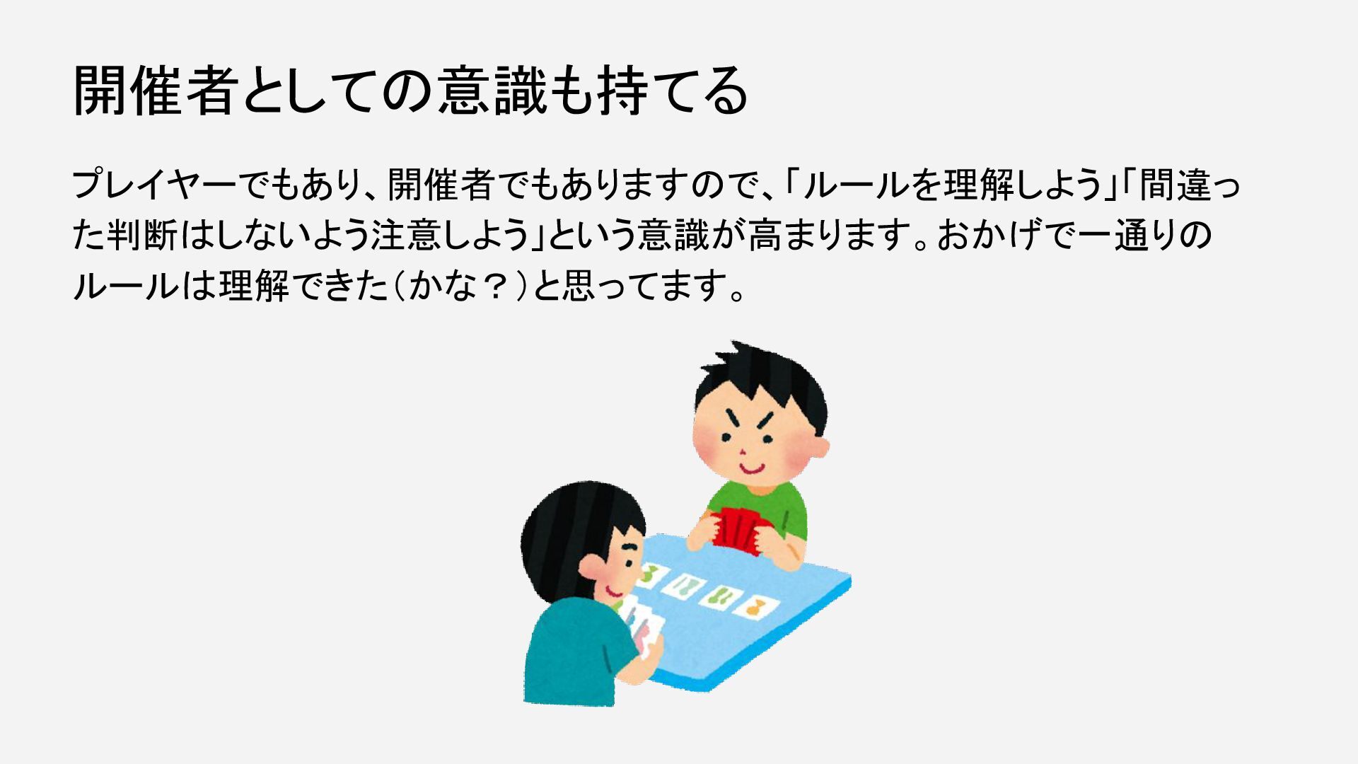プレイヤーでもあり、開催者でもありますので、「ルールを理解しよう」「間違っ た判断はしないよう注意しよう」という意識が高まります。おかげで一通りの ルールは理解できた(かな?)と思ってます。 開催者としての意識も持てる