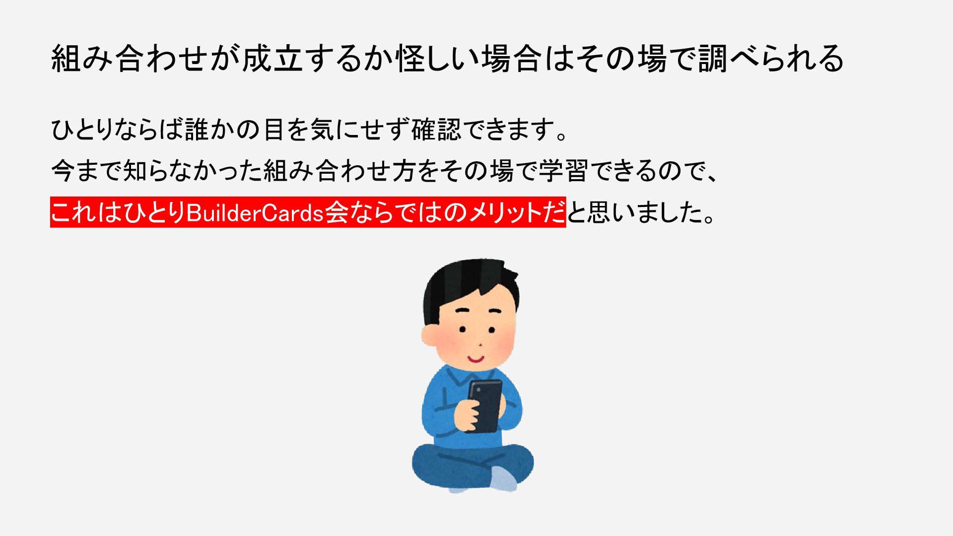 ひとりならば誰かの目を気にせず確認できます。 今まで知らなかった組み合わせ方をその場で学習できるので、 これはひとりBuilderCards会ならではのメリットだと思いました。 組み合わせが成立するか怪しい場合はその場で調べられる
