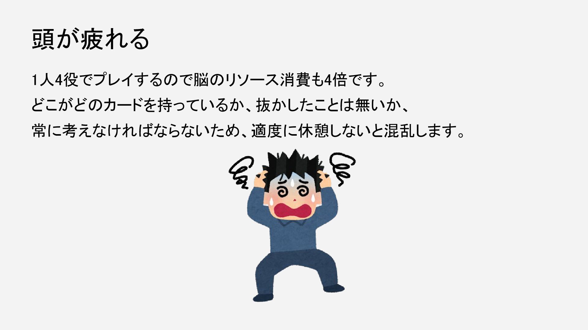 1人4役でプレイするので脳のリソース消費も4倍です。 どこがどのカードを持っているか、抜かしたことは無いか、 常に考えなければならないため、適度に休憩しないと混乱します。 頭が疲れる