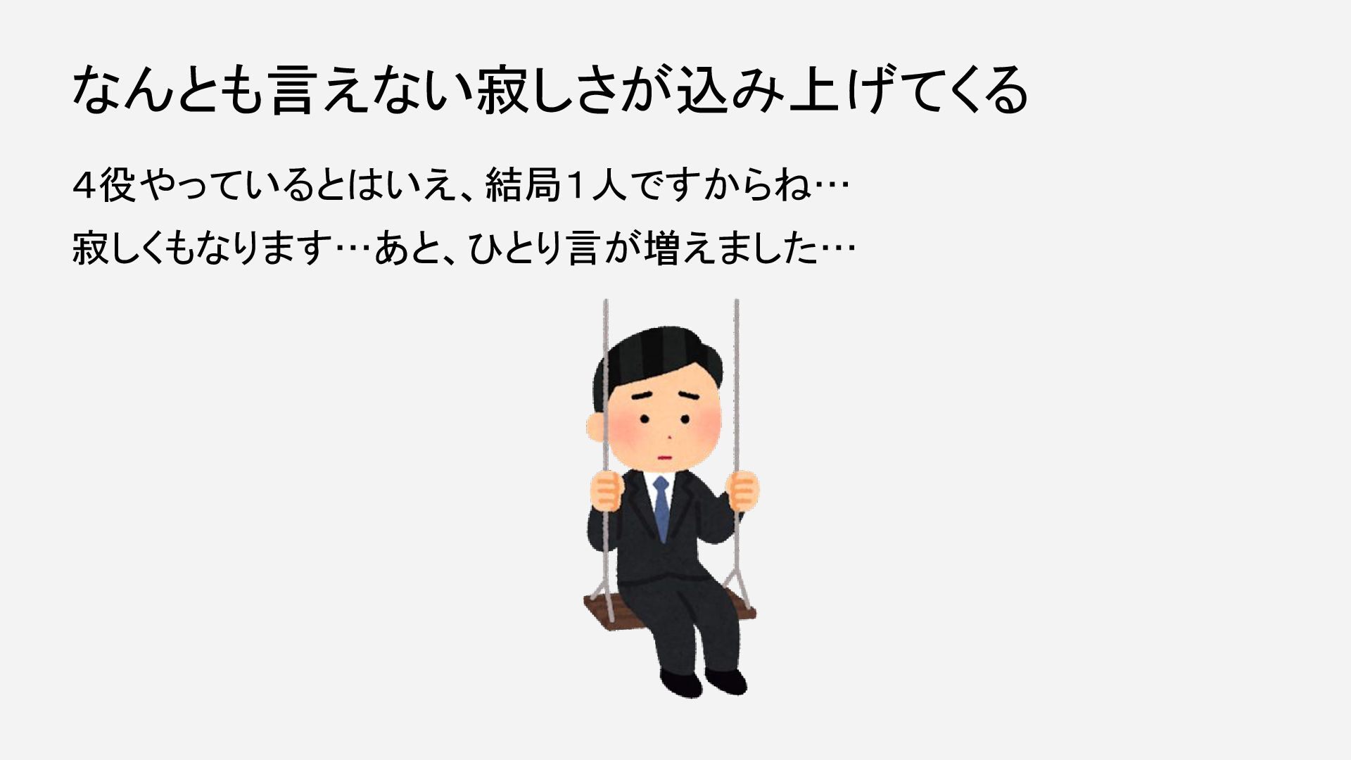 4役やっているとはいえ、結局1人ですからね… 寂しくもなります…あと、ひとり言が増えました… なんとも言えない寂しさが込み上げてくる