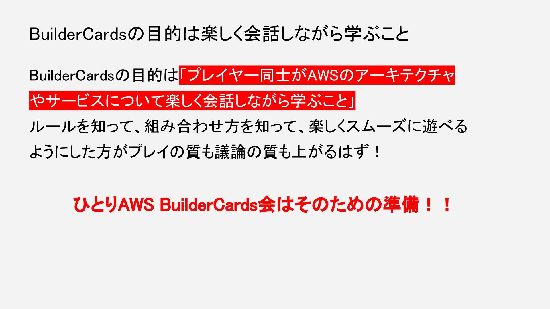 BuilderCardsの目的は「プレイヤー同士がAWSのアーキテクチャ やサービスについて楽しく会話しながら学ぶこと」 ルールを知って、組み合わせ方を知って、楽しくスムーズに遊べる ようにした方がプレイの質も議論の質も上がるはず! ひとりAWS BuilderCards会はそのための準備!! BuilderCardsの目的は楽しく会話しながら学ぶこと