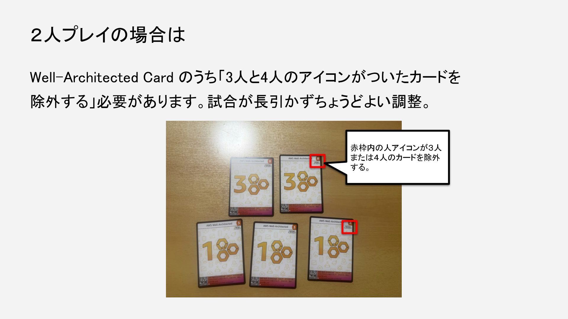 Well-Architected Card のうち「3人と4人のアイコンがついたカードを 除外する」必要があります。試合が長引かずちょうどよい調整。 2人プレイの場合は 赤枠内の人アイコンが3人 または4人のカードを除外 する。