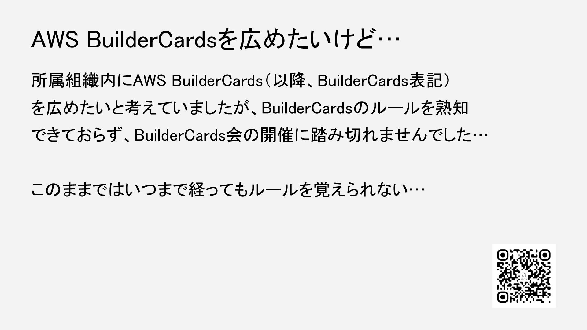 所属組織内にAWS BuilderCards(以降、BuilderCards表記) を広めたいと考えていましたが、BuilderCardsのルールを熟知 できておらず、BuilderCards会の開催に踏み切れませんでした… このままではいつまで経ってもルールを覚えられない… AWS BuilderCardsを広めたいけど…