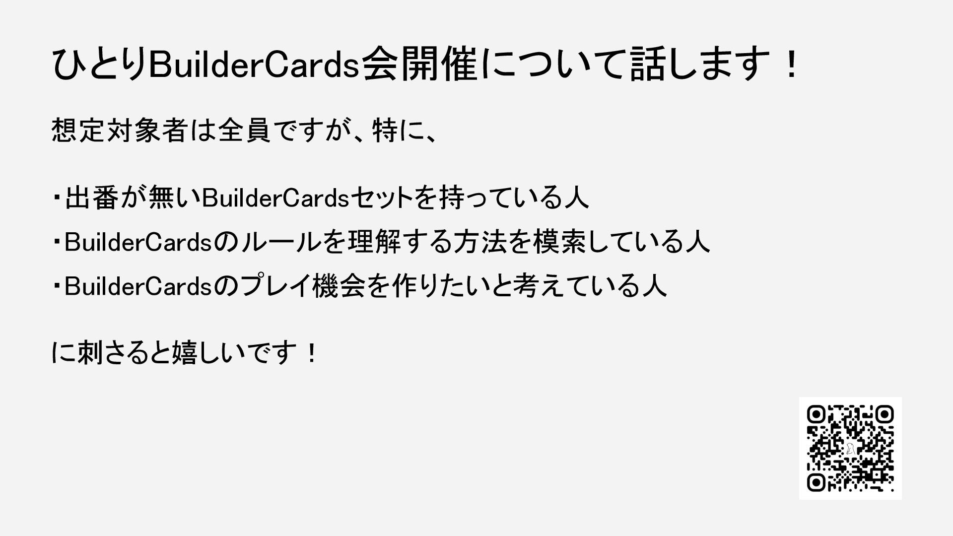 想定対象者は全員ですが、特に、 ・出番が無いBuilderCardsセットを持っている人 ・BuilderCardsのルールを理解する方法を模索している人 ・BuilderCardsのプレイ機会を作りたいと考えている人 に刺さると嬉しいです! ひとりBuilderCards会開催について話します!