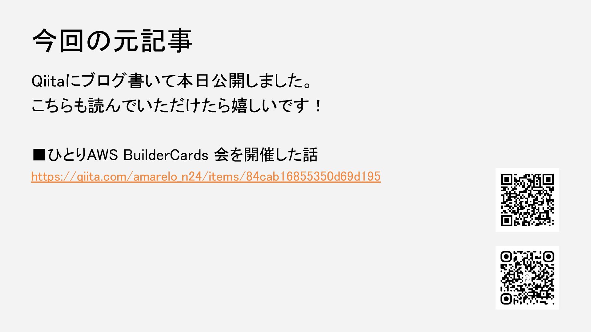 Qiitaにブログ書いて本日公開しました。 こちらも読んでいただけたら嬉しいです! ▪ひとりAWS BuilderCards 会を開催した話 https://qiita.com/amarelo_n24/items/84cab16855350d69d195 今回の元記事