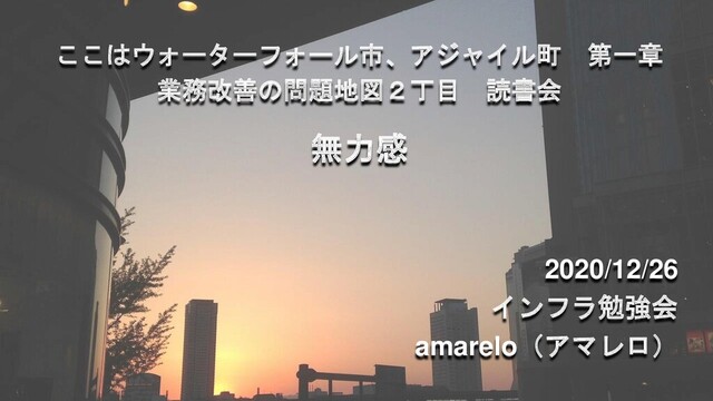 ここはウォーターフォール市、アジャイル町 第一章 業務改善の問題地図2丁目 読書会 無力感 2020/12/26 インフラ勉強会 amarelo(アマレロ)
