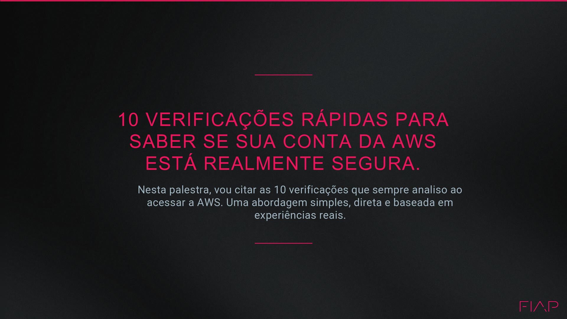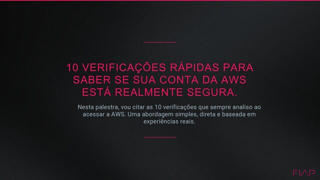 ESTÁ REALMENTE SEGURA. Nesta palestra, vou citar as 10 verificações que sempre analiso ao acessar a AWS. Uma abordagem simples, direta e baseada em experiências reais.
