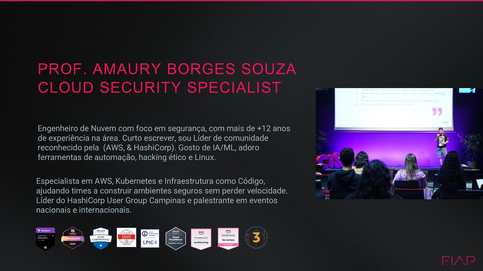 com foco em segurança, com mais de +12 anos de experiência na área. Curto escrever, sou Líder de comunidade reconhecido pela (AWS, & HashiCorp). Gosto de IA/ML, adoro ferramentas de automação, hacking ético e Linux. Especialista em AWS, Kubernetes e Infraestrutura como Código, ajudando times a construir ambientes seguros sem perder velocidade. Líder do HashiCorp User Group Campinas e palestrante em eventos nacionais e internacionais.