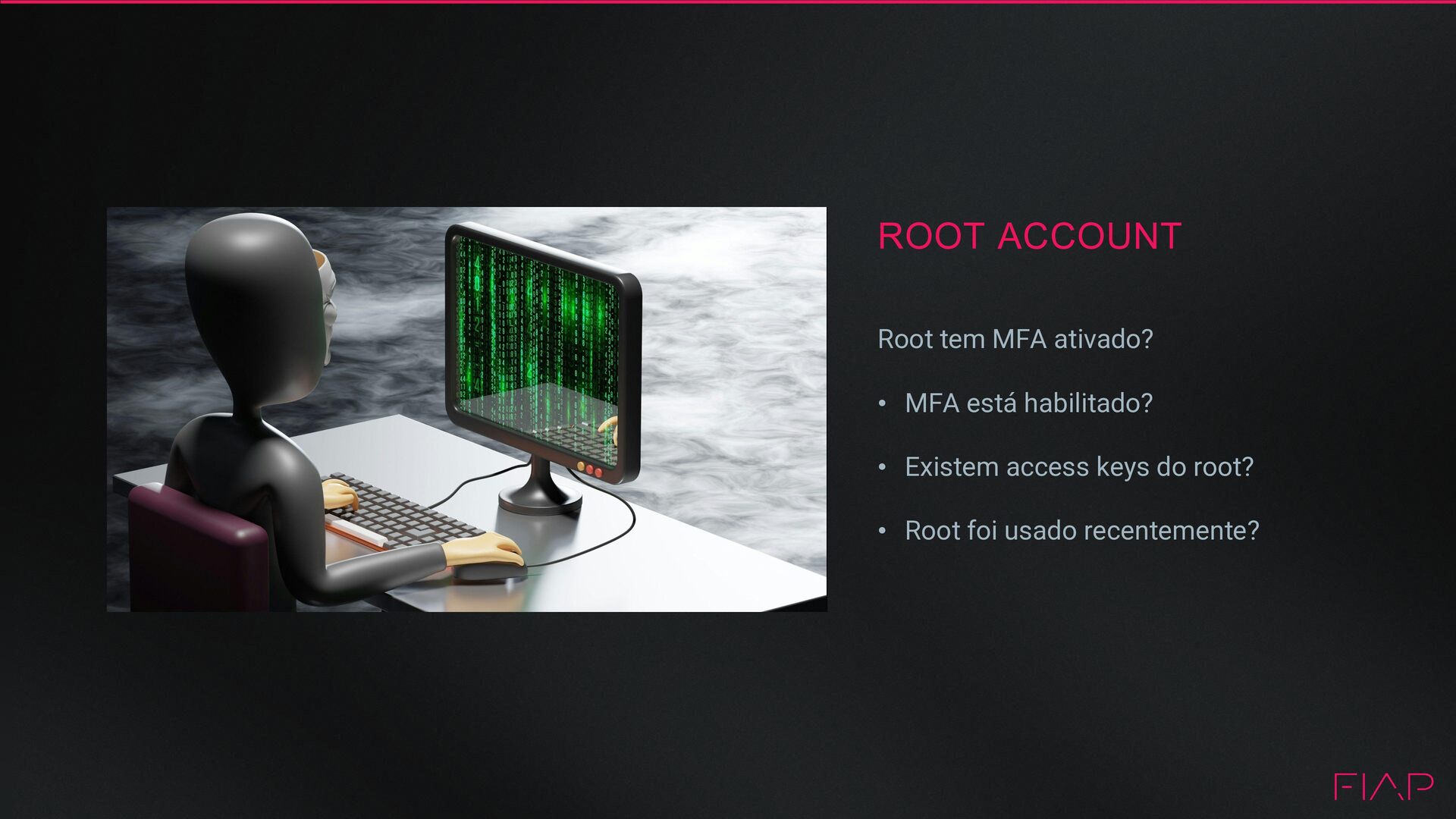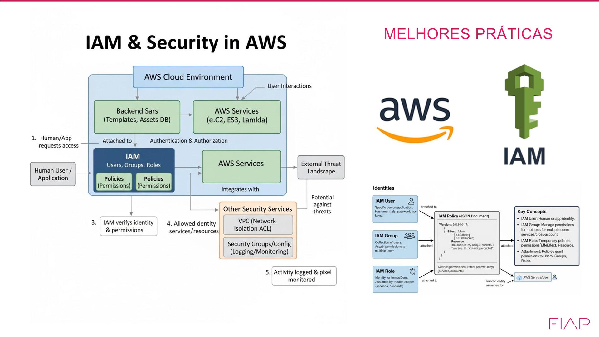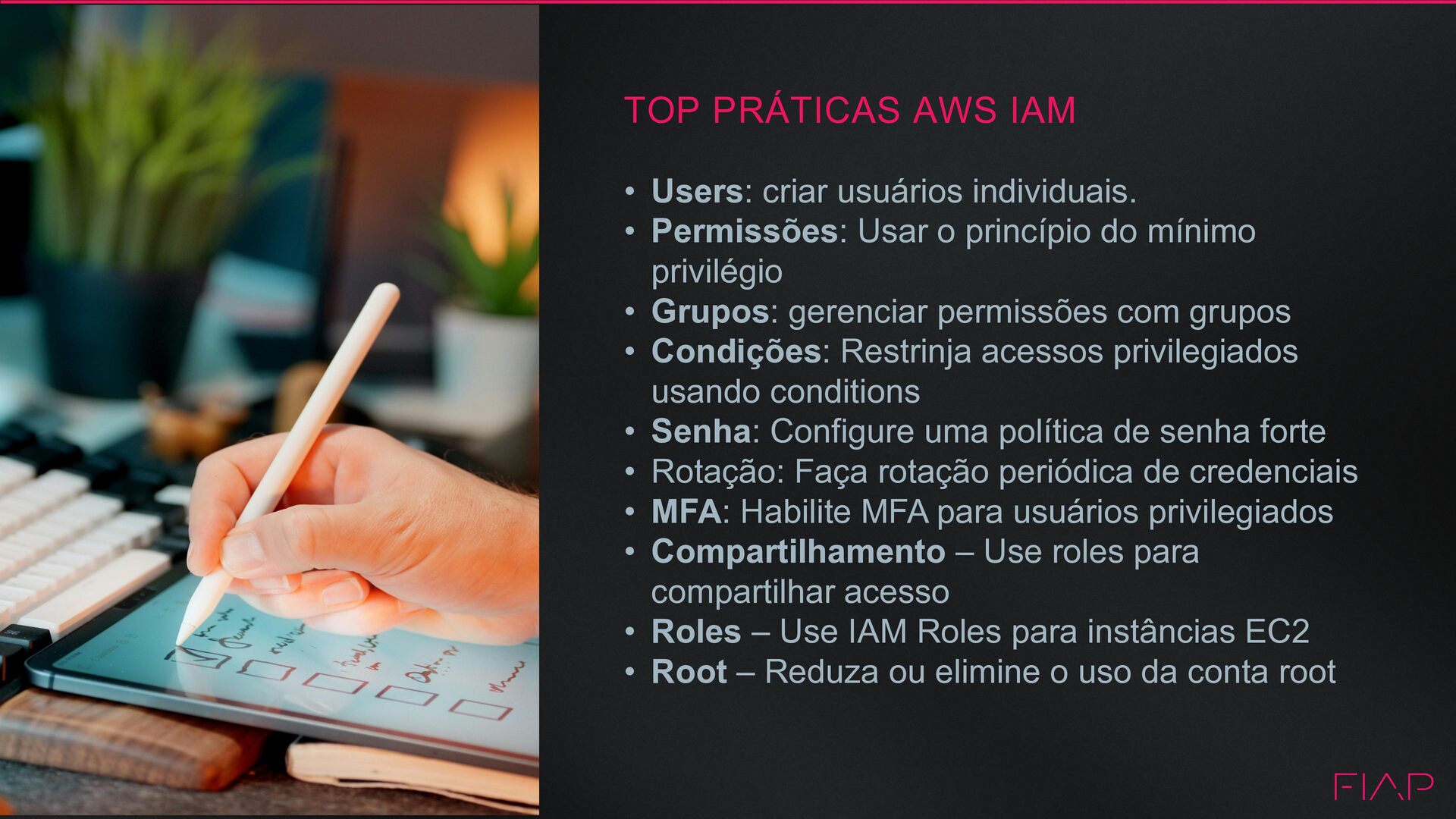 • Permissões: Usar o princípio do mínimo privilégio • Grupos: gerenciar permissões com grupos • Condições: Restrinja acessos privilegiados usando conditions • Senha: Configure uma política de senha forte • Rotação: Faça rotação periódica de credenciais • MFA: Habilite MFA para usuários privilegiados • Compartilhamento – Use roles para compartilhar acesso • Roles – Use IAM Roles para instâncias EC2 • Root – Reduza ou elimine o uso da conta root