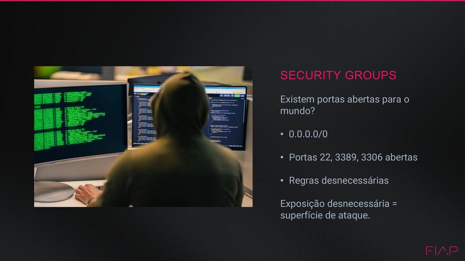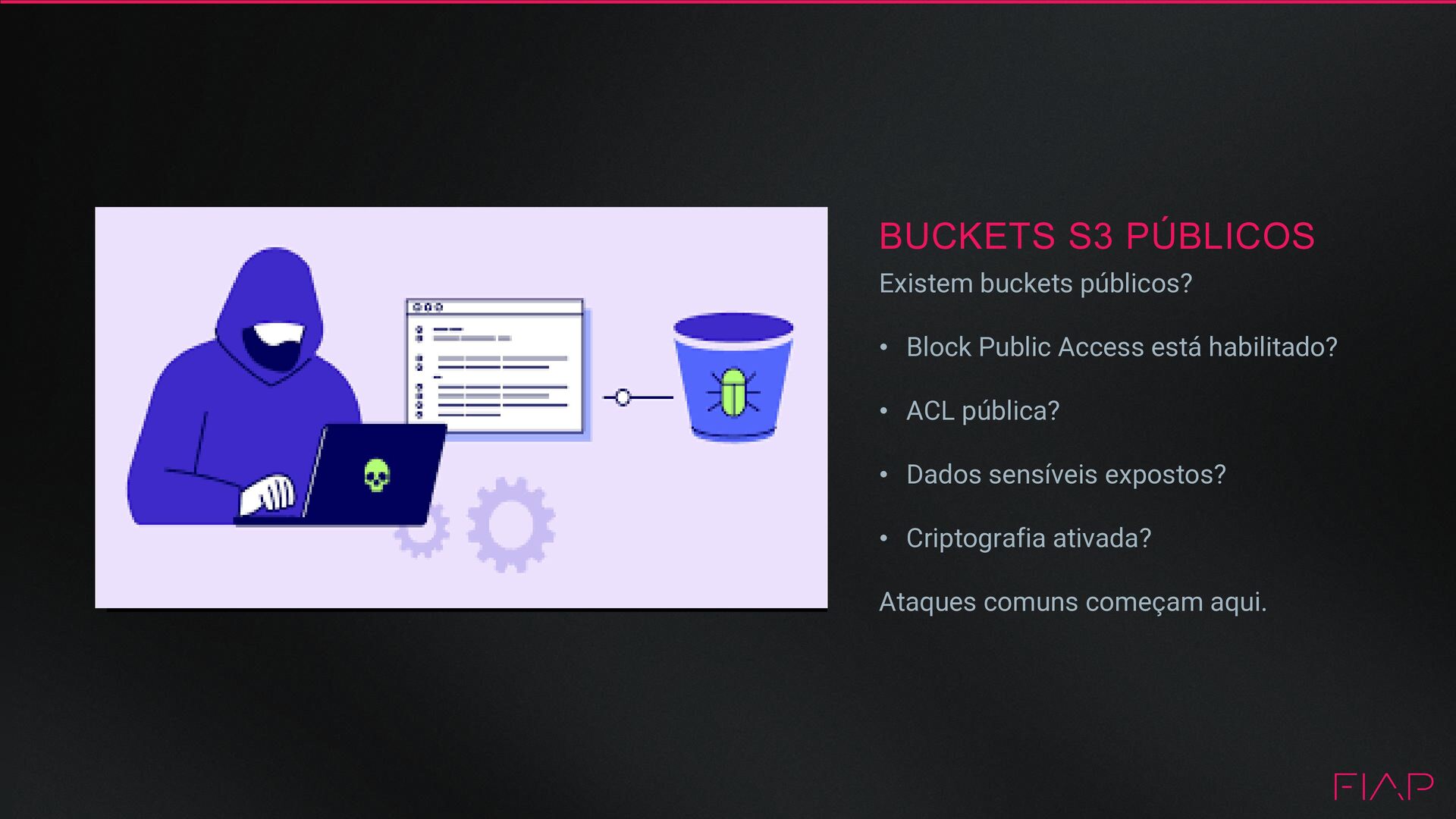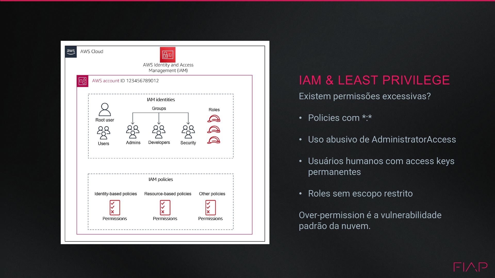 com *:* • Uso abusivo de AdministratorAccess • Usuários humanos com access keys permanentes • Roles sem escopo restrito Over-permission é a vulnerabilidade padrão da nuvem.