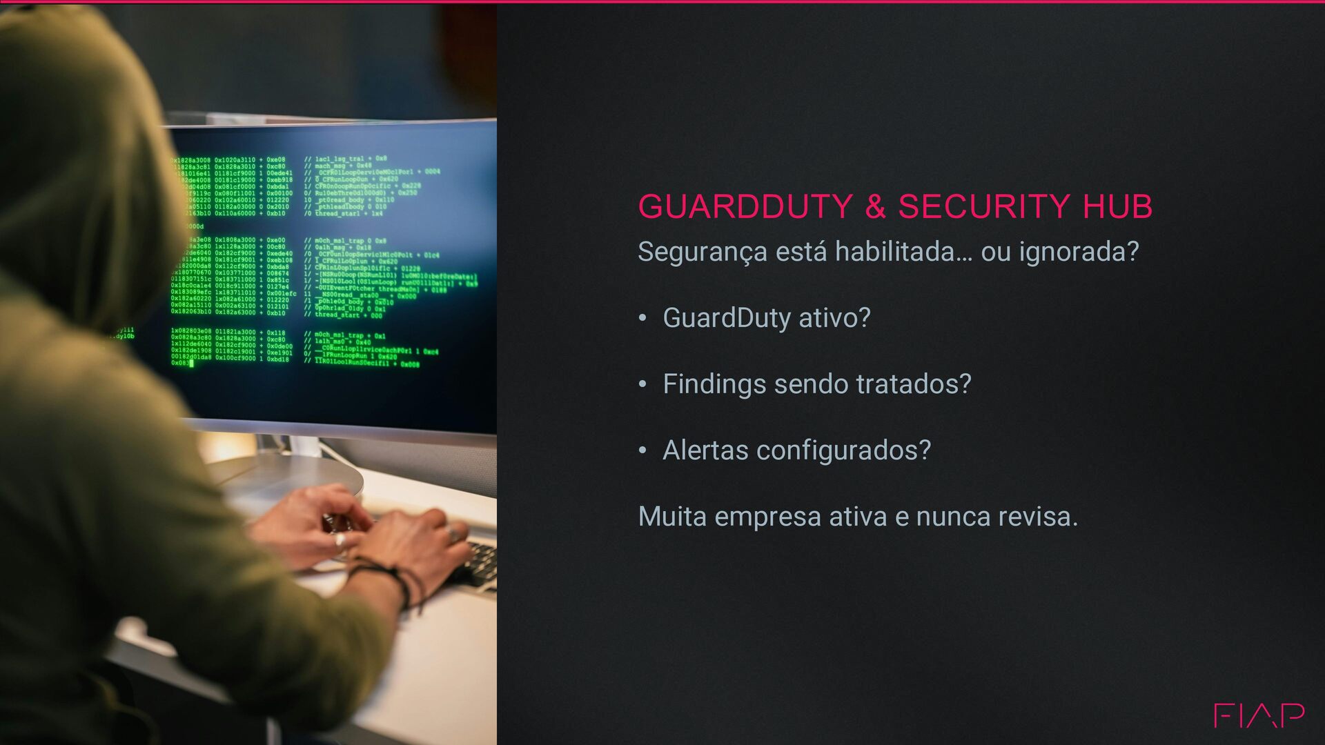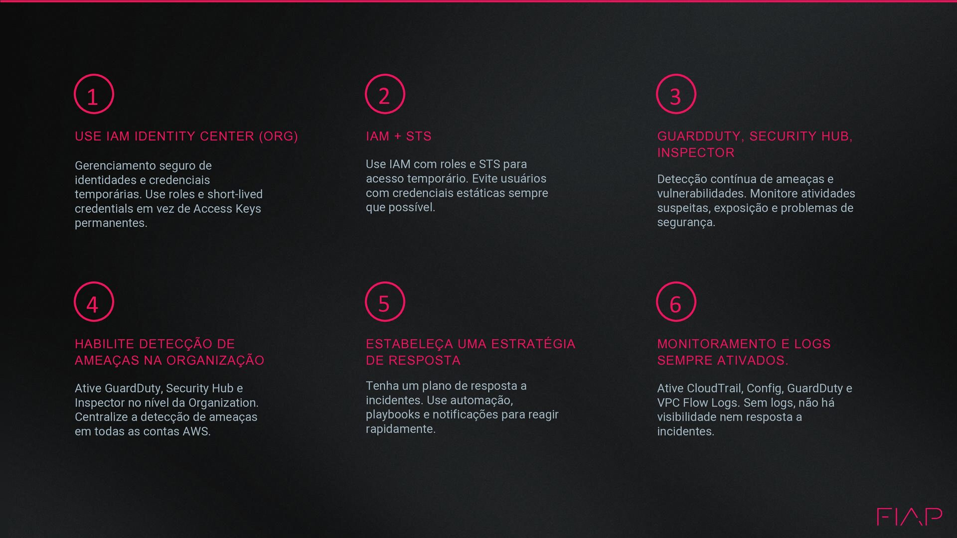 e credenciais temporárias. Use roles e short-lived credentials em vez de Access Keys permanentes. 3 GUARDDUTY, SECURITY HUB, INSPECTOR Detecção contínua de ameaças e vulnerabilidades. Monitore atividades suspeitas, exposição e problemas de segurança. 2 IAM + STS Use IAM com roles e STS para acesso temporário. Evite usuários com credenciais estáticas sempre que possível. 4 HABILITE DETECÇÃO DE AMEAÇAS NA ORGANIZAÇÃO Ative GuardDuty, Security Hub e Inspector no nível da Organization. Centralize a detecção de ameaças em todas as contas AWS. 6 MONITORAMENTO E LOGS SEMPRE ATIVADOS. Ative CloudTrail, Config, GuardDuty e VPC Flow Logs. Sem logs, não há visibilidade nem resposta a incidentes. 5 ESTABELEÇA UMA ESTRATÉGIA DE RESPOSTA Tenha um plano de resposta a incidentes. Use automação, playbooks e notificações para reagir rapidamente.