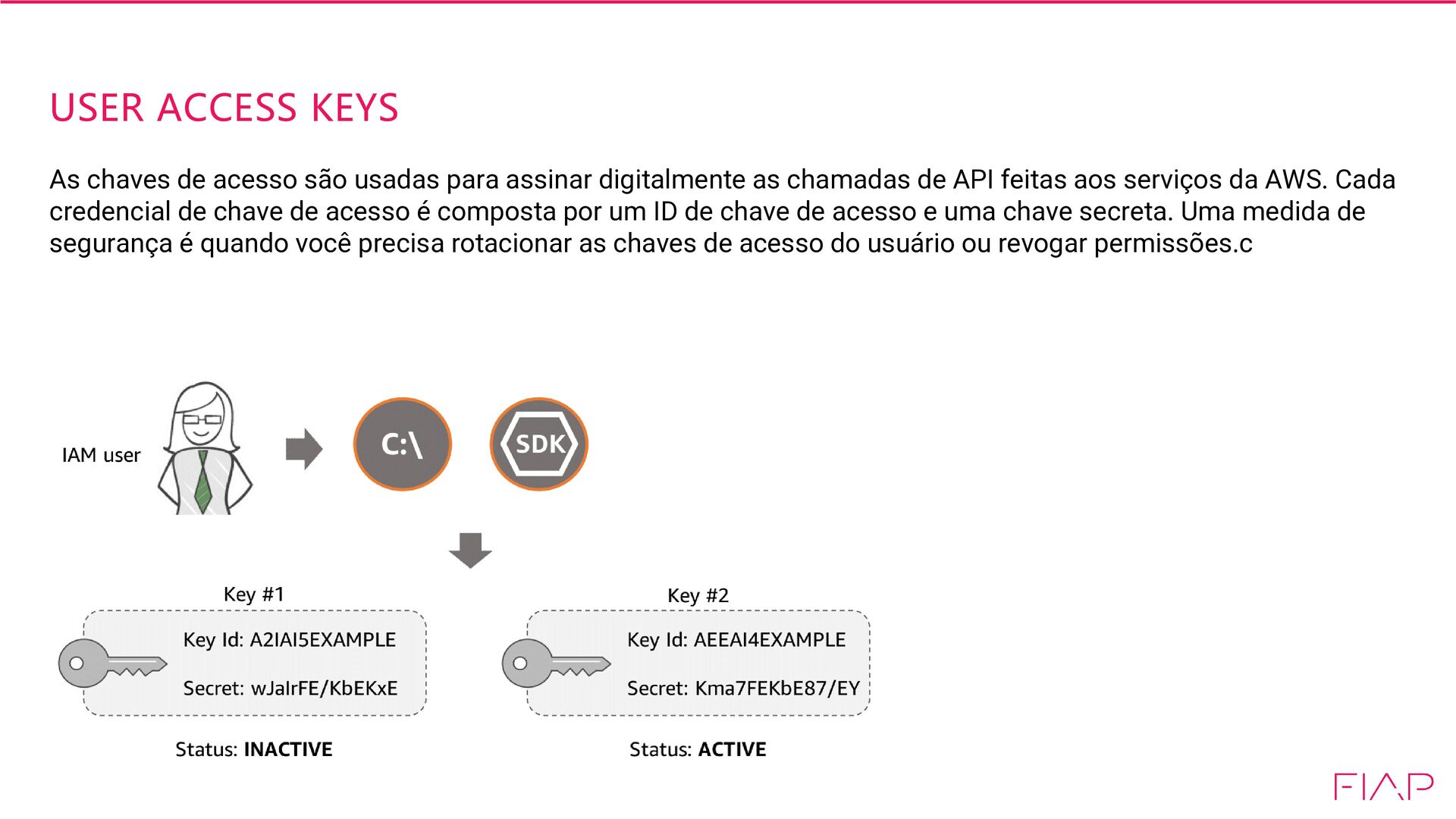 assinar digitalmente as chamadas de API feitas aos serviços da AWS. Cada credencial de chave de acesso é composta por um ID de chave de acesso e uma chave secreta. Uma medida de segurança é quando você precisa rotacionar as chaves de acesso do usuário ou revogar permissões.c