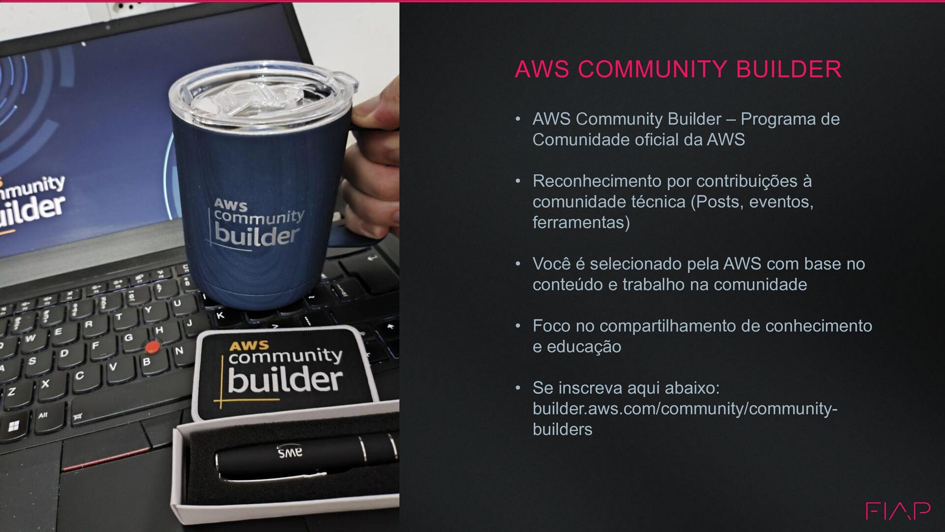 de Comunidade oficial da AWS • Reconhecimento por contribuições à comunidade técnica (Posts, eventos, ferramentas) • Você é selecionado pela AWS com base no conteúdo e trabalho na comunidade • Foco no compartilhamento de conhecimento e educação • Se inscreva aqui abaixo: builder.aws.com/community/community- builders