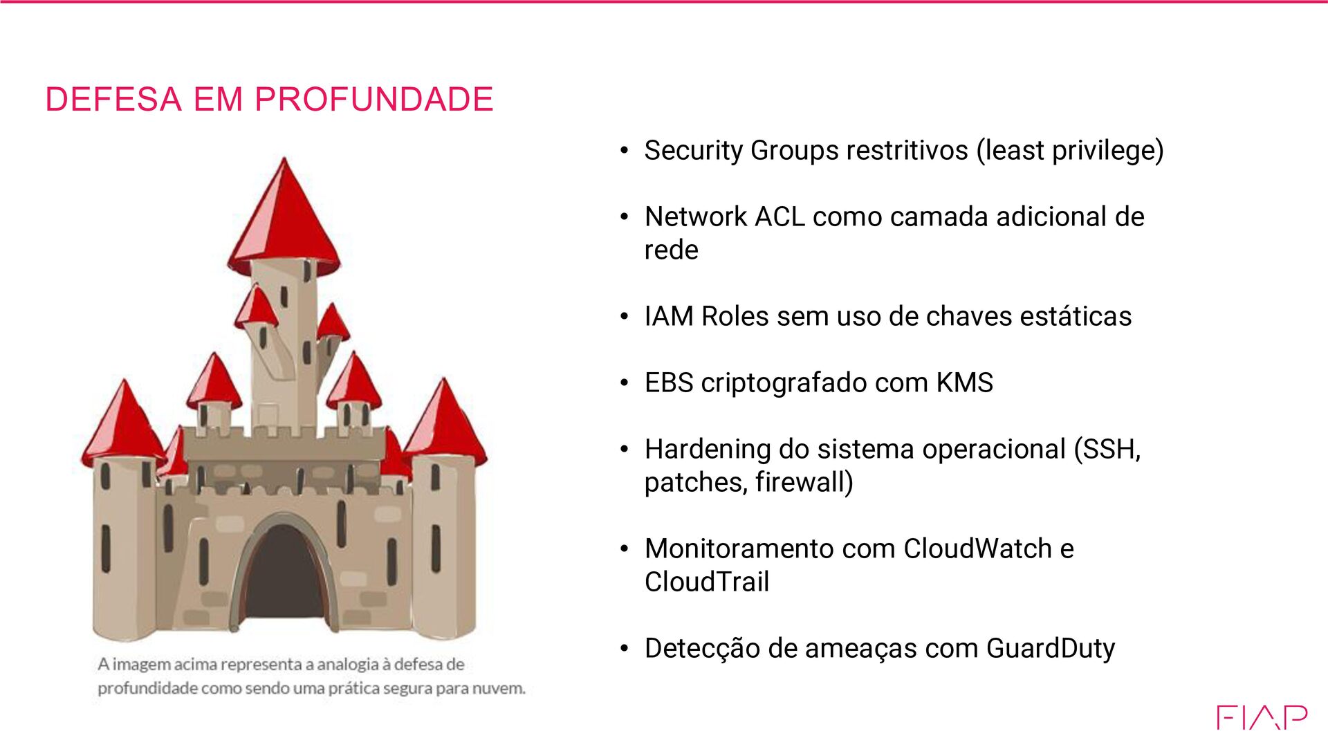 Network ACL como camada adicional de rede • IAM Roles sem uso de chaves estáticas • EBS criptografado com KMS • Hardening do sistema operacional (SSH, patches, firewall) • Monitoramento com CloudWatch e CloudTrail • Detecção de ameaças com GuardDuty