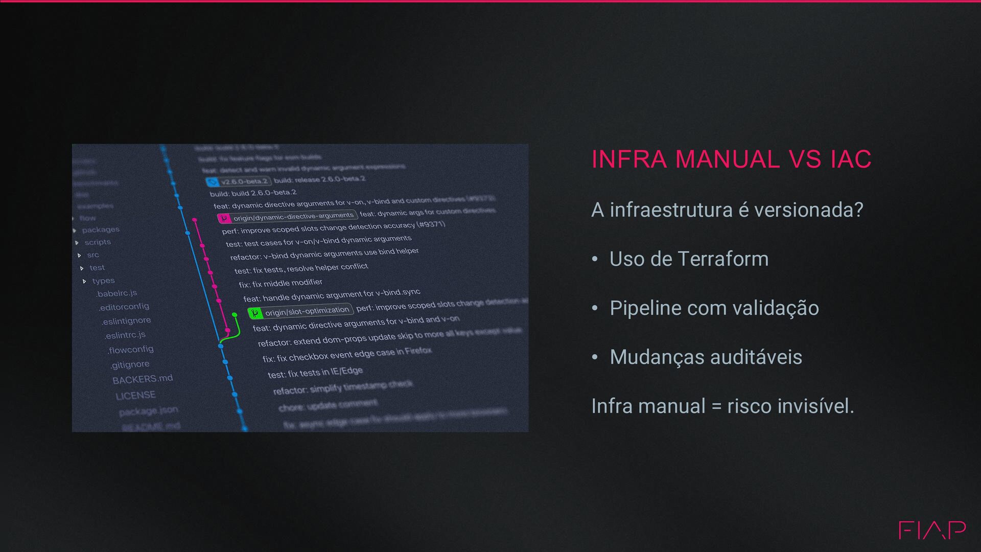 • Infraestrutura definida como código (Terraform) • Versionamento em Git • Revisões via Pull Requests • Segurança validada no pipeline • Histórico auditável das mudanças