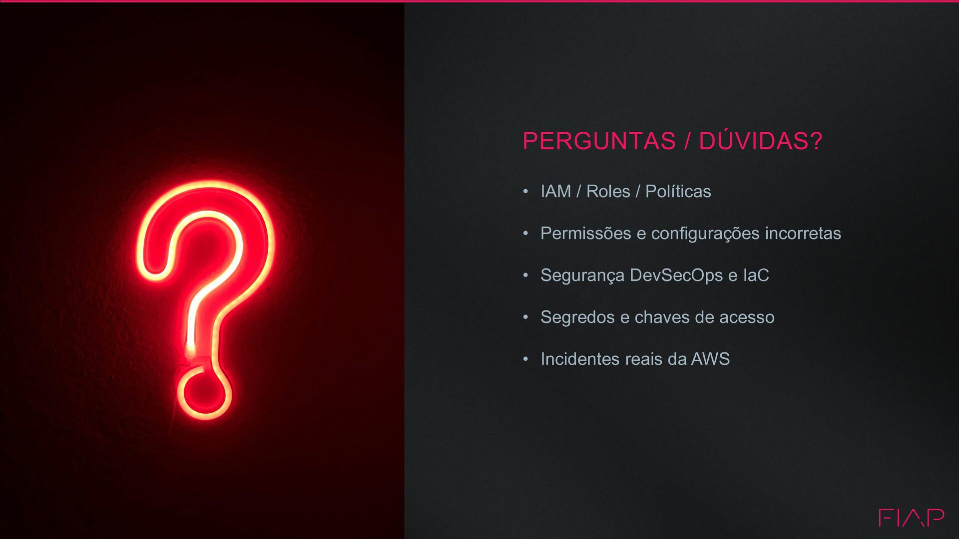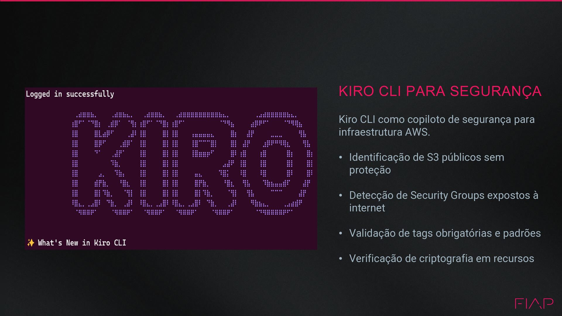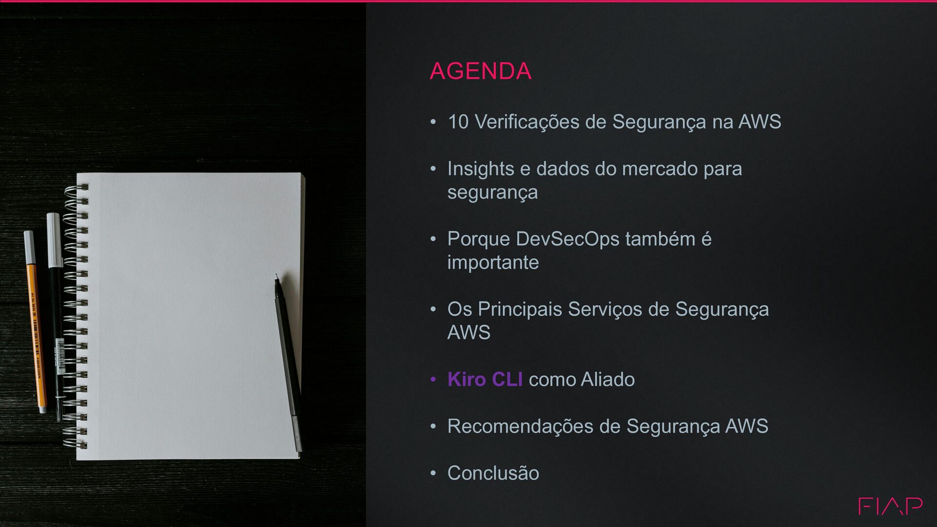 Insights e dados do mercado para segurança • Porque DevSecOps também é importante • Os Principais Serviços de Segurança AWS • Kiro CLI como Aliado • Recomendações de Segurança AWS • Conclusão