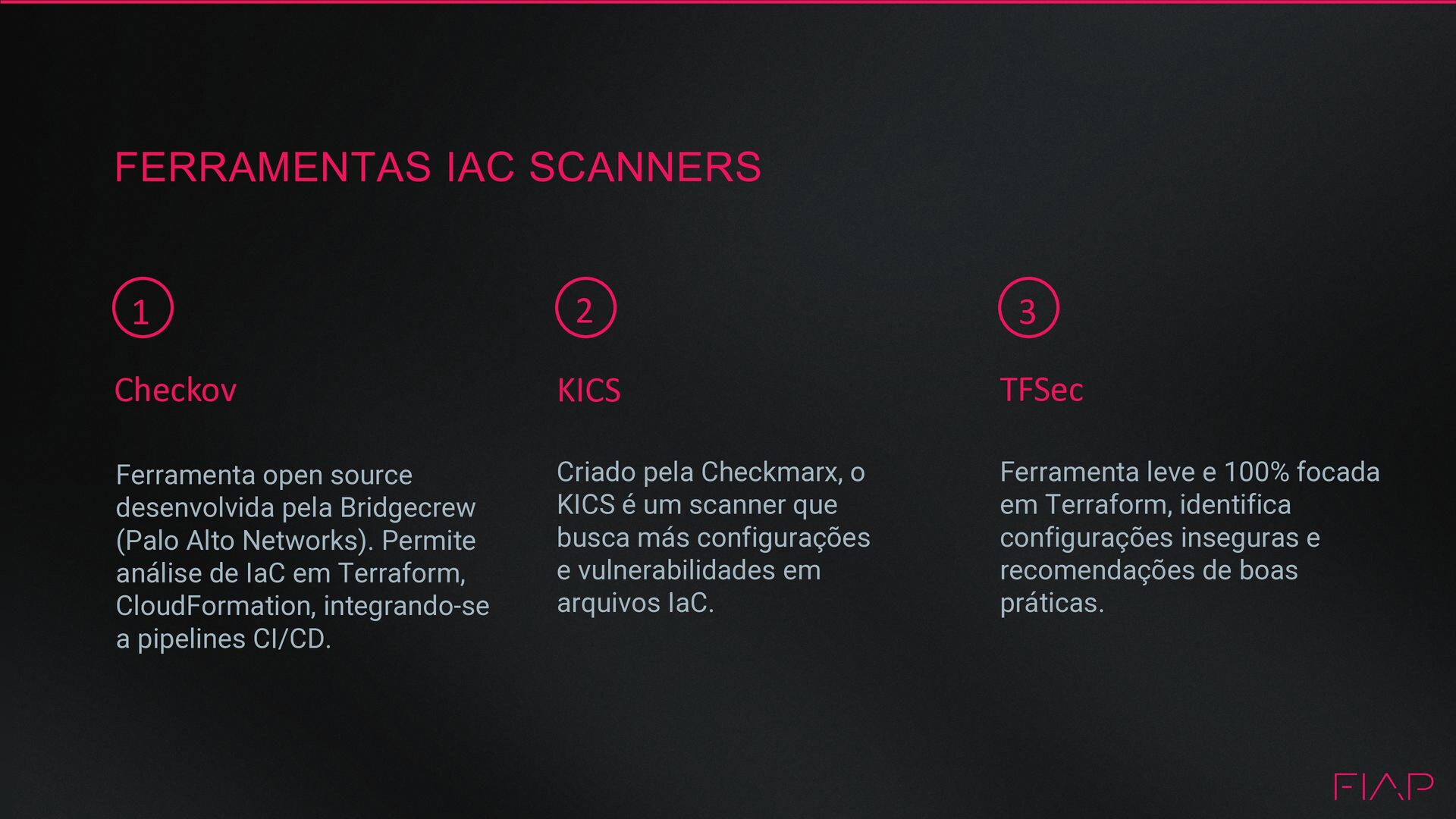 Networks). Permite análise de IaC em Terraform, CloudFormation, integrando-se a pipelines CI/CD. 3 Ferramenta leve e 100% focada em Terraform, identifica configurações inseguras e recomendações de boas práticas. 2 Criado pela Checkmarx, o KICS é um scanner que busca más configurações e vulnerabilidades em arquivos IaC. KICS TFSec FERRAMENTAS IAC SCANNERS