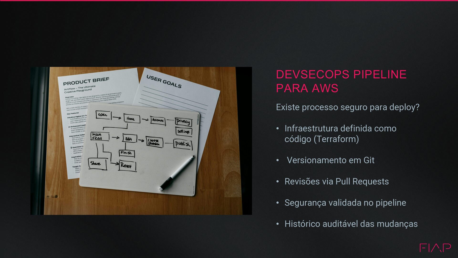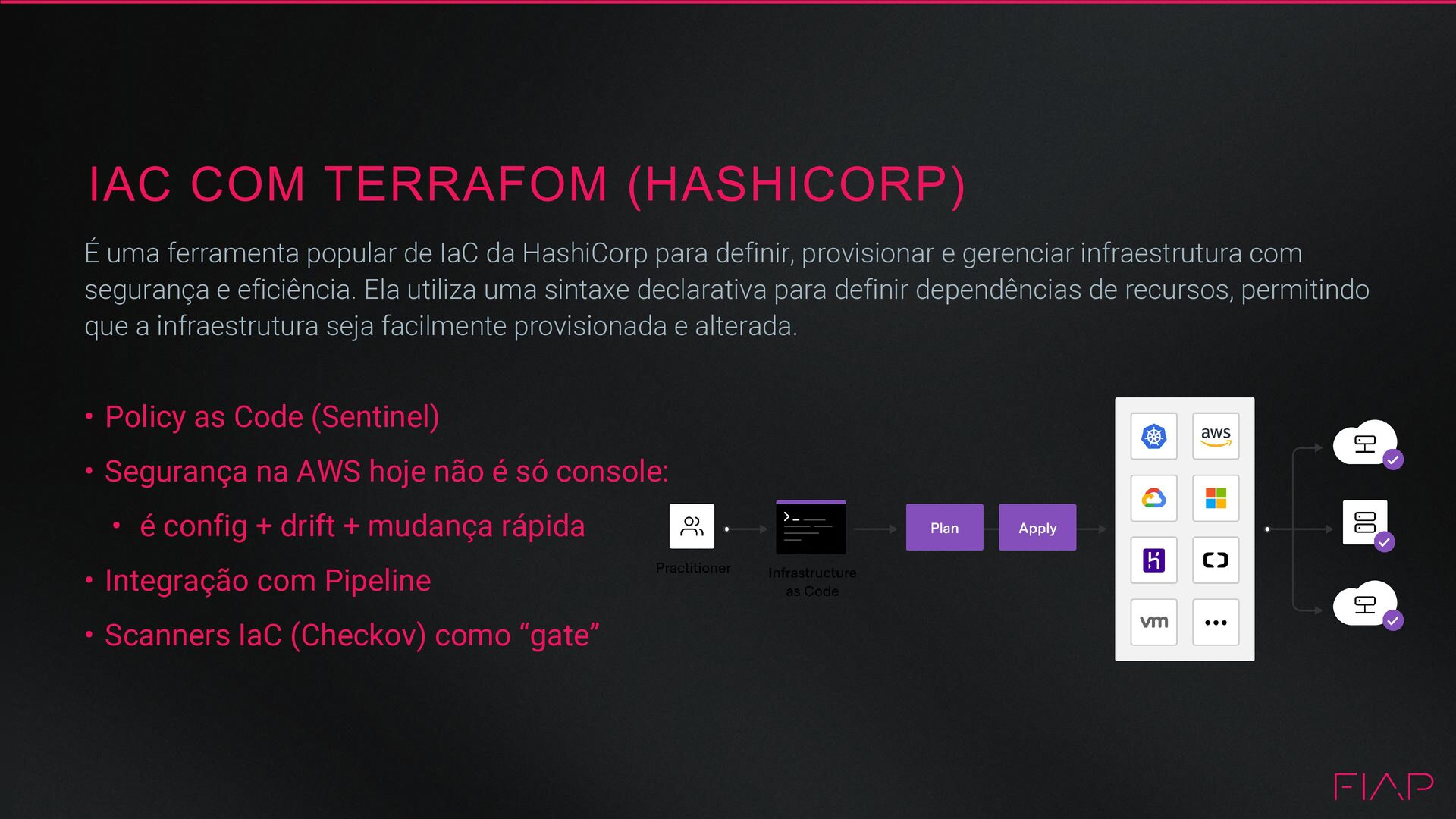 Segurança na AWS hoje não é só console: • é config + drift + mudança rápida • Integração com Pipeline • Scanners IaC (Checkov) como “gate” É uma ferramenta popular de IaC da HashiCorp para definir, provisionar e gerenciar infraestrutura com segurança e eficiência. Ela utiliza uma sintaxe declarativa para definir dependências de recursos, permitindo que a infraestrutura seja facilmente provisionada e alterada.