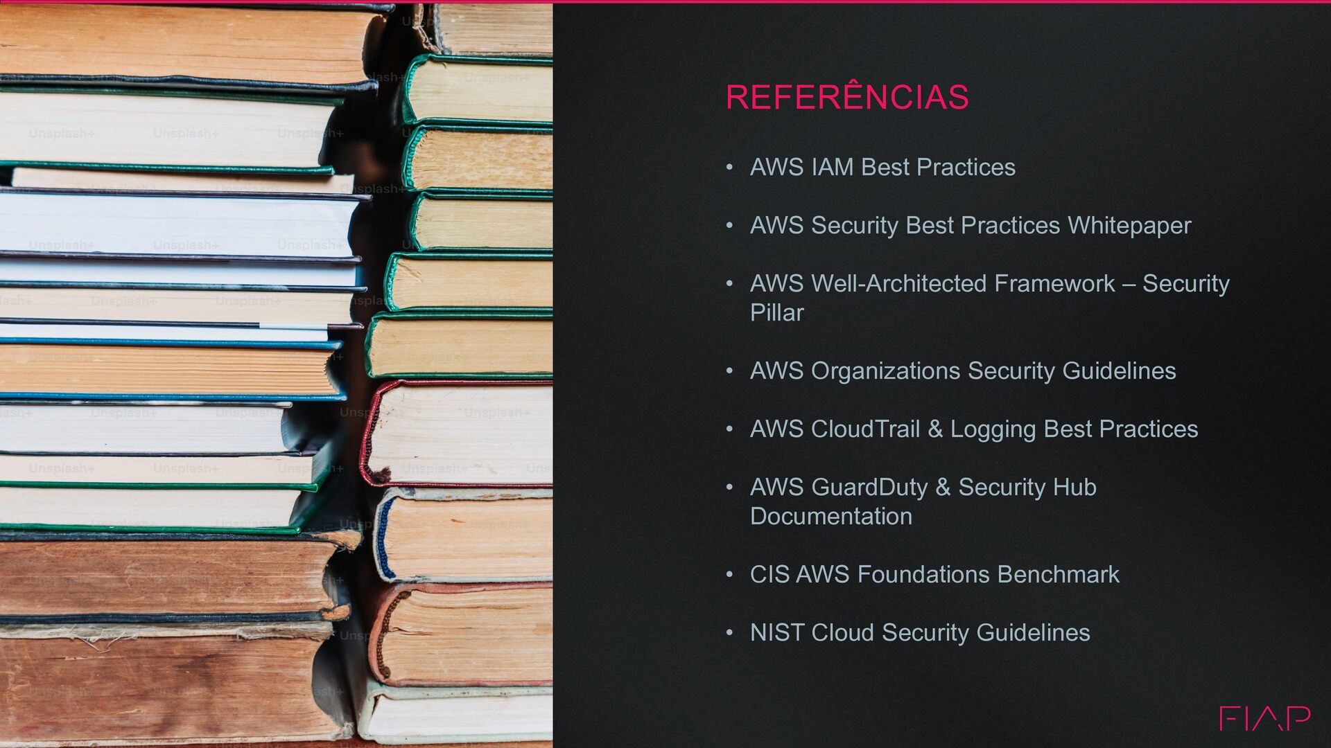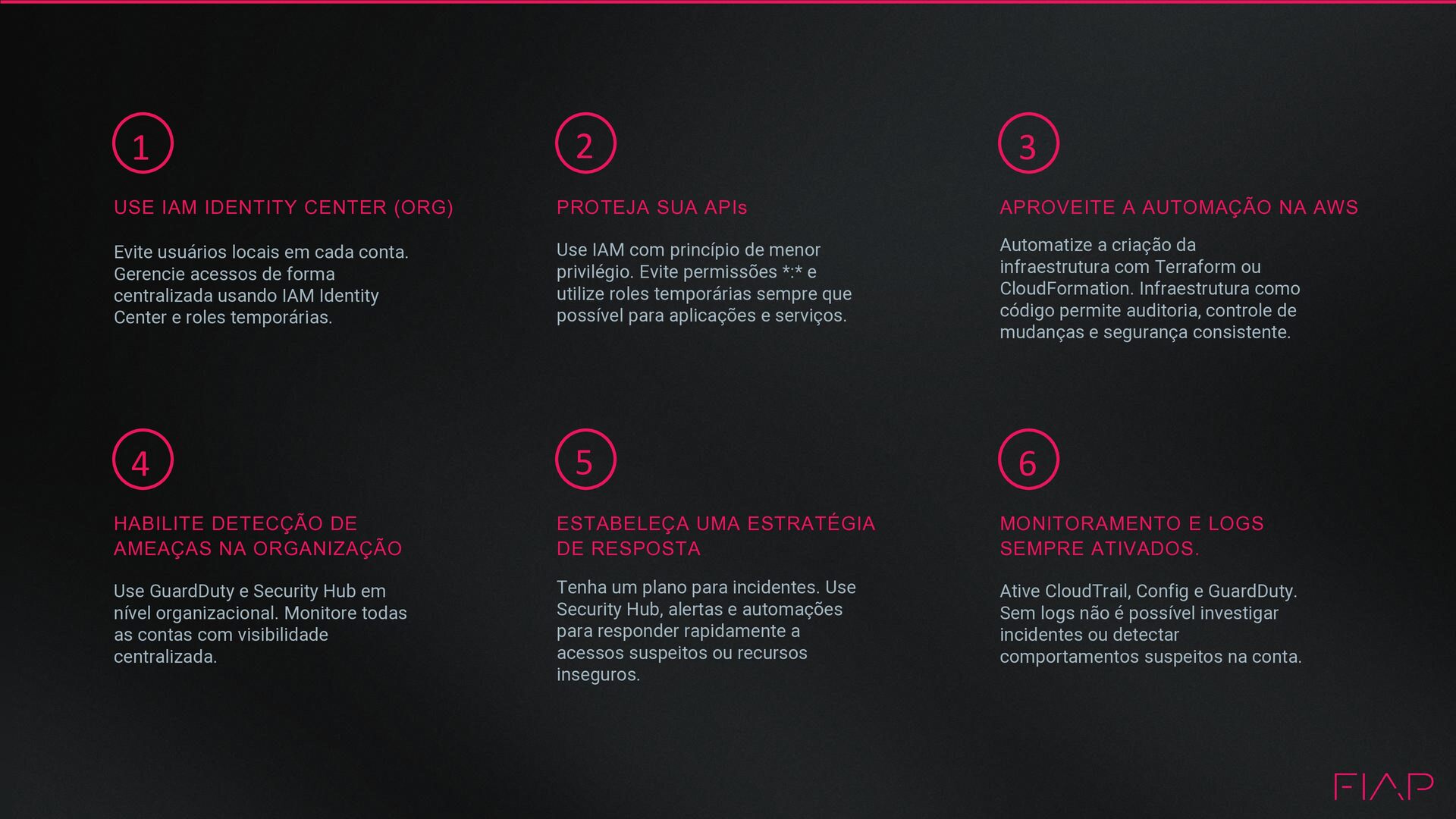 cada conta. Gerencie acessos de forma centralizada usando IAM Identity Center e roles temporárias. 3 APROVEITE A AUTOMAÇÃO NA AWS Automatize a criação da infraestrutura com Terraform ou CloudFormation. Infraestrutura como código permite auditoria, controle de mudanças e segurança consistente. 2 PROTEJA SUA APIs Use IAM com princípio de menor privilégio. Evite permissões *:* e utilize roles temporárias sempre que possível para aplicações e serviços. 4 HABILITE DETECÇÃO DE AMEAÇAS NA ORGANIZAÇÃO Use GuardDuty e Security Hub em nível organizacional. Monitore todas as contas com visibilidade centralizada. 6 MONITORAMENTO E LOGS SEMPRE ATIVADOS. Ative CloudTrail, Config e GuardDuty. Sem logs não é possível investigar incidentes ou detectar comportamentos suspeitos na conta. 5 ESTABELEÇA UMA ESTRATÉGIA DE RESPOSTA Tenha um plano para incidentes. Use Security Hub, alertas e automações para responder rapidamente a acessos suspeitos ou recursos inseguros.