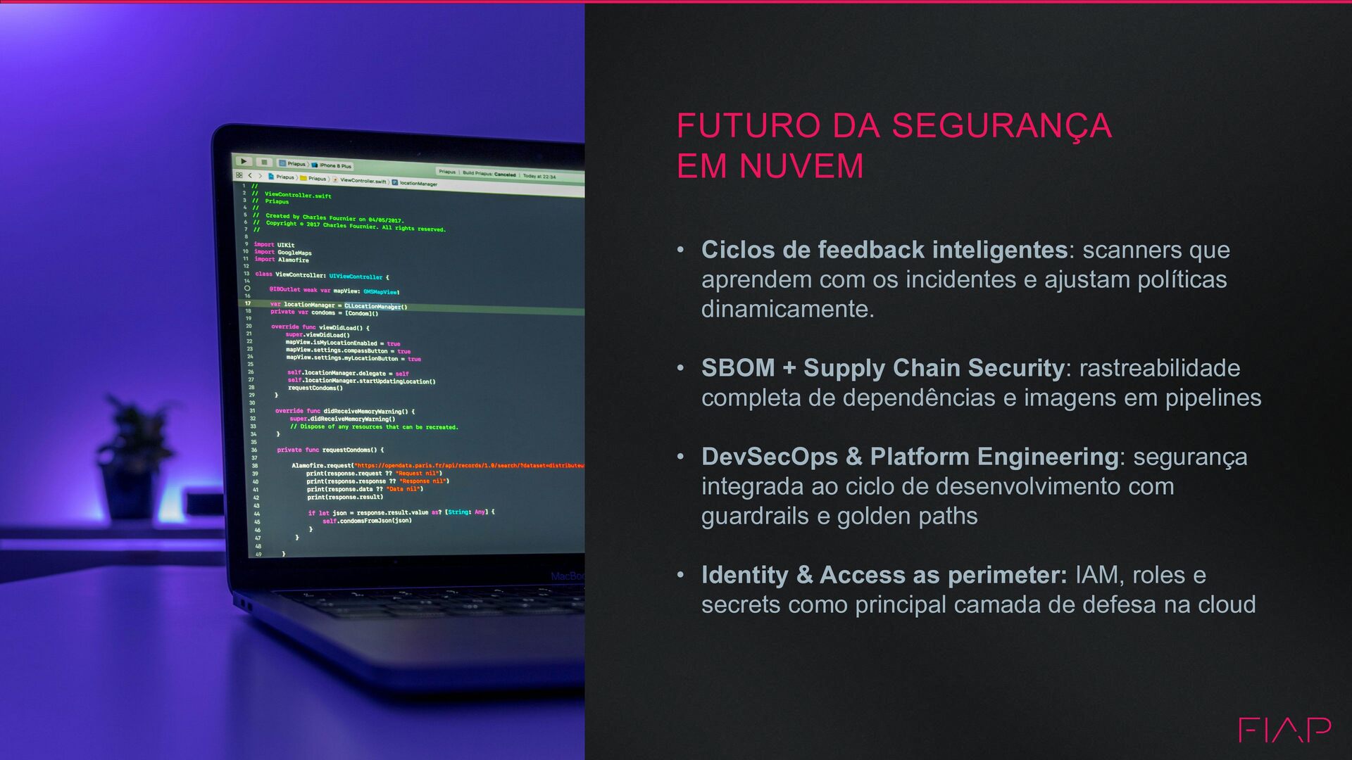 inteligentes: scanners que aprendem com os incidentes e ajustam políticas dinamicamente. • SBOM + Supply Chain Security: rastreabilidade completa de dependências e imagens em pipelines • DevSecOps & Platform Engineering: segurança integrada ao ciclo de desenvolvimento com guardrails e golden paths • Identity & Access as perimeter: IAM, roles e secrets como principal camada de defesa na cloud