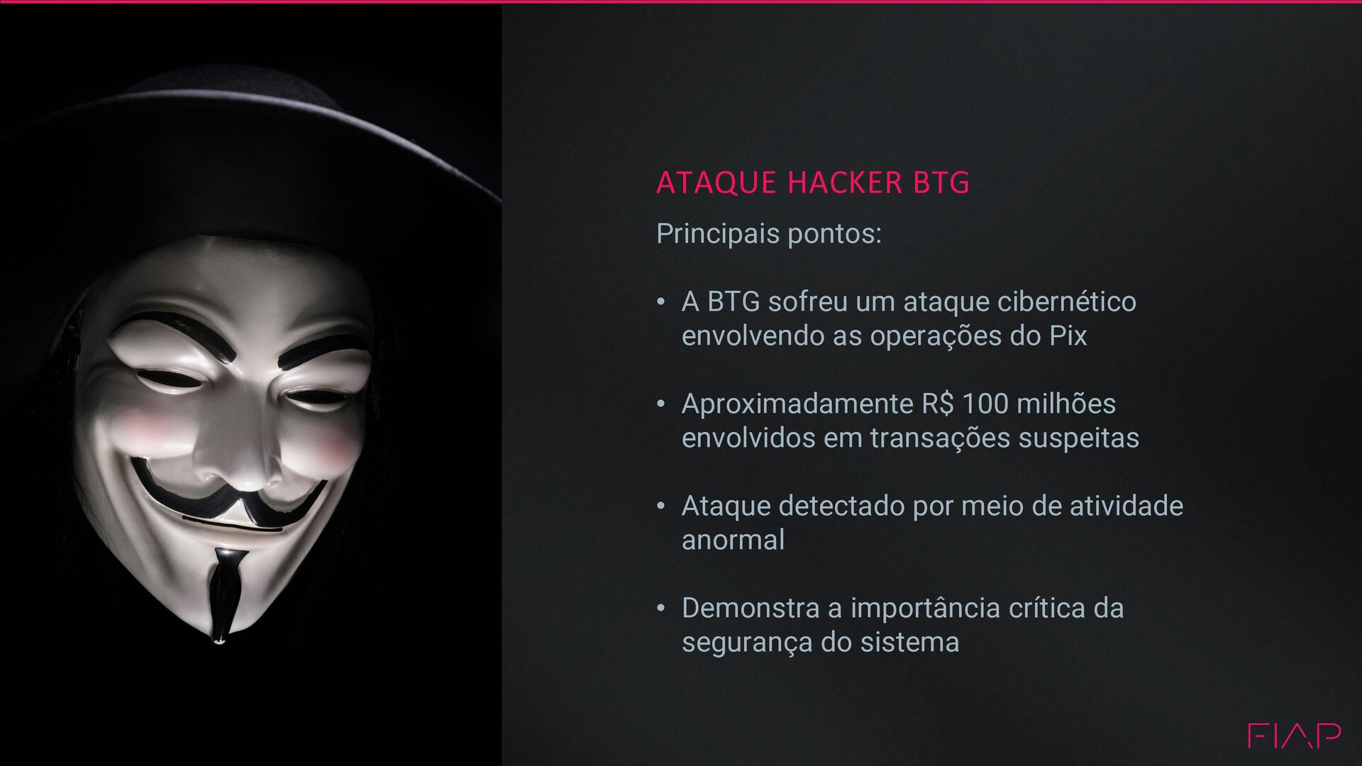 ataque cibernético envolvendo as operações do Pix • Aproximadamente R$ 100 milhões envolvidos em transações suspeitas • Ataque detectado por meio de atividade anormal • Demonstra a importância crítica da segurança do sistema