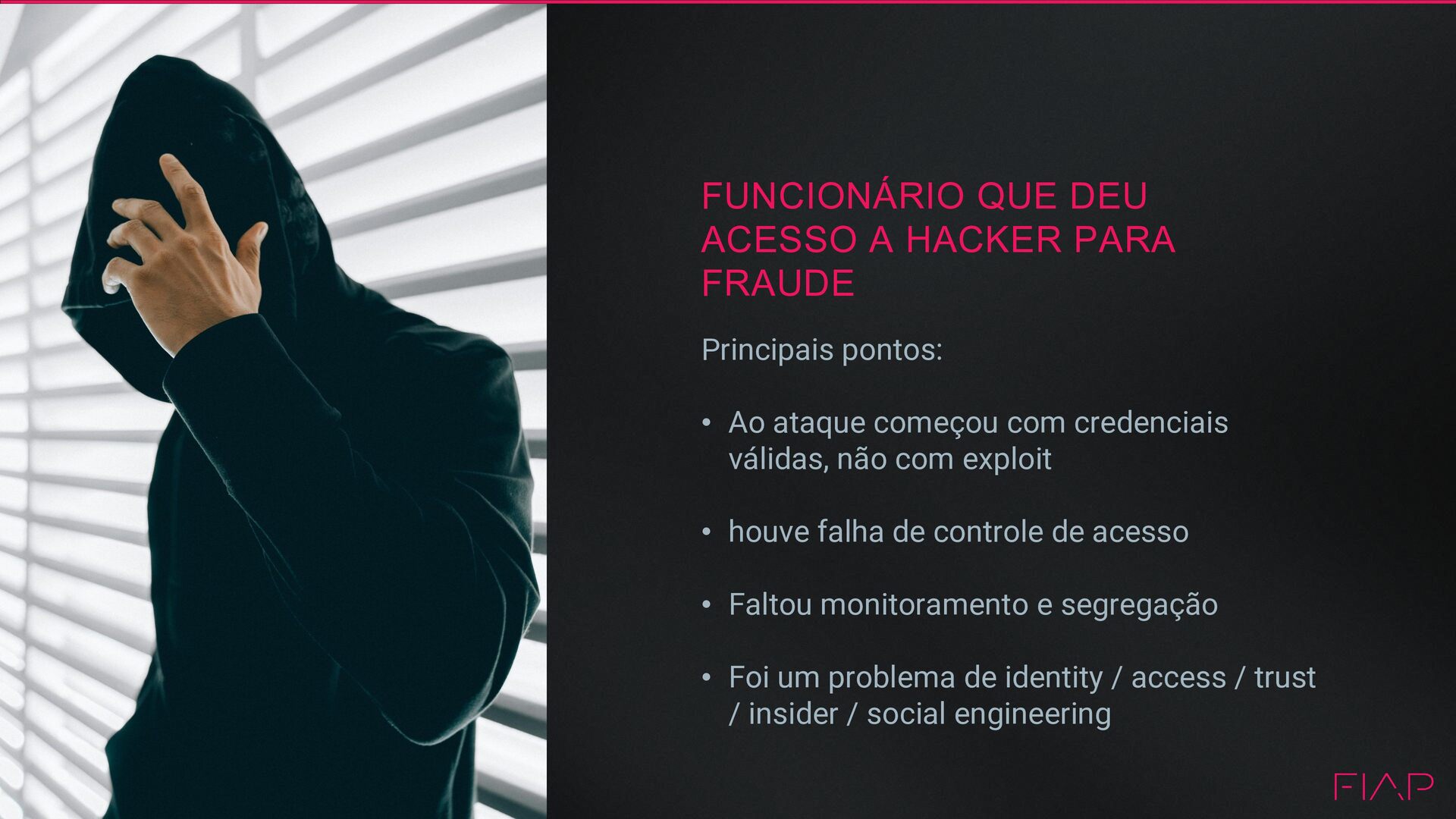 • Ao ataque começou com credenciais válidas, não com exploit • houve falha de controle de acesso • Faltou monitoramento e segregação • Foi um problema de identity / access / trust / insider / social engineering
