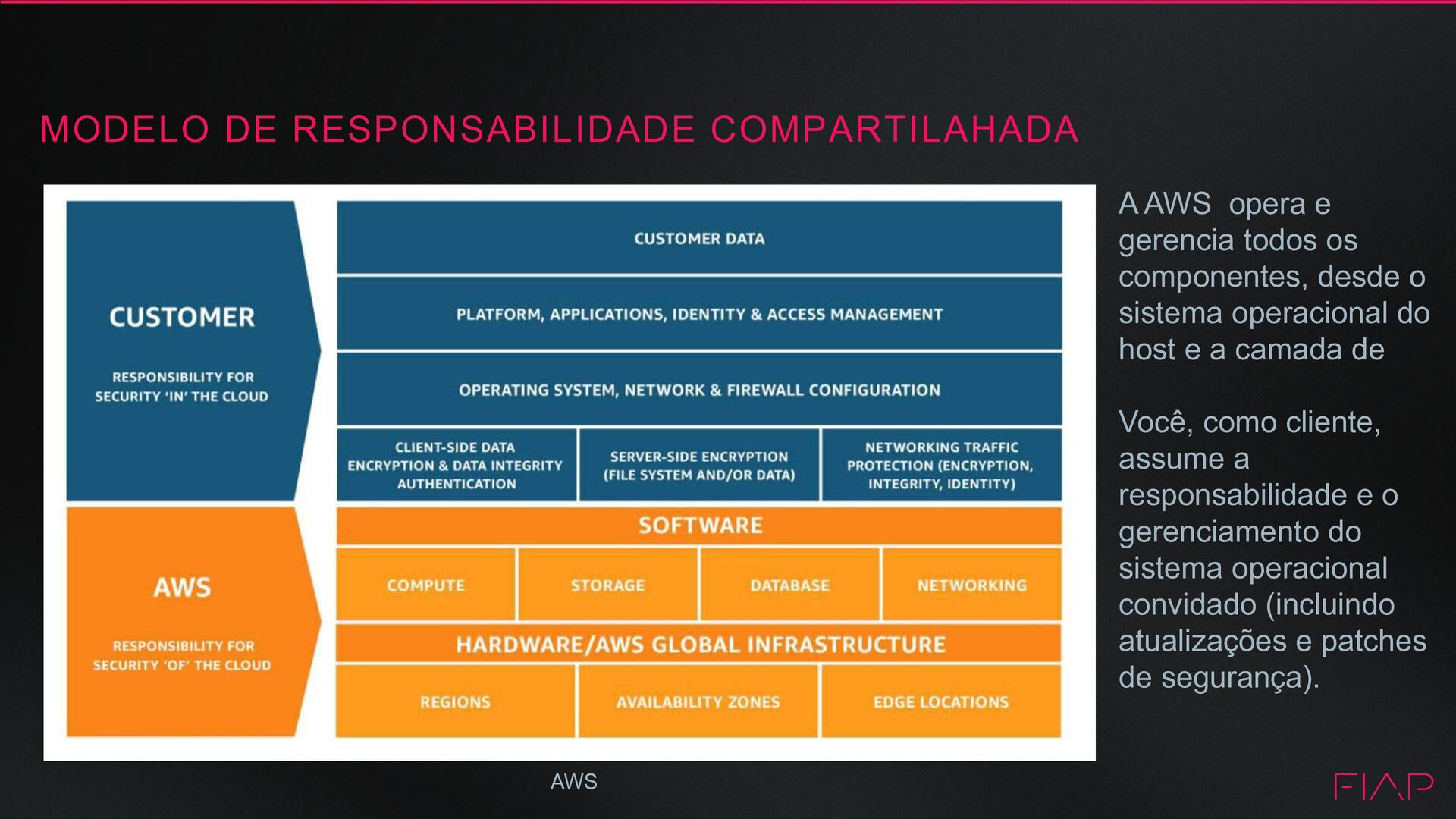 os componentes, desde o sistema operacional do host e a camada de Você, como cliente, assume a responsabilidade e o gerenciamento do sistema operacional convidado (incluindo atualizações e patches de segurança). AWS