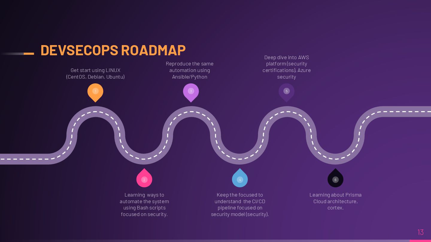 start using LINUX (CentOS, Debian, Ubuntu) Reproduce the same automation using Ansible/Python Deep dive into AWS platform (security certifications), Azure security Learning ways to automate the system using Bash scripts focused on security. Keep the focused to understand the CI/CD pipeline focused on security model (security). Learning about Prisma Cloud architecture, cortex.