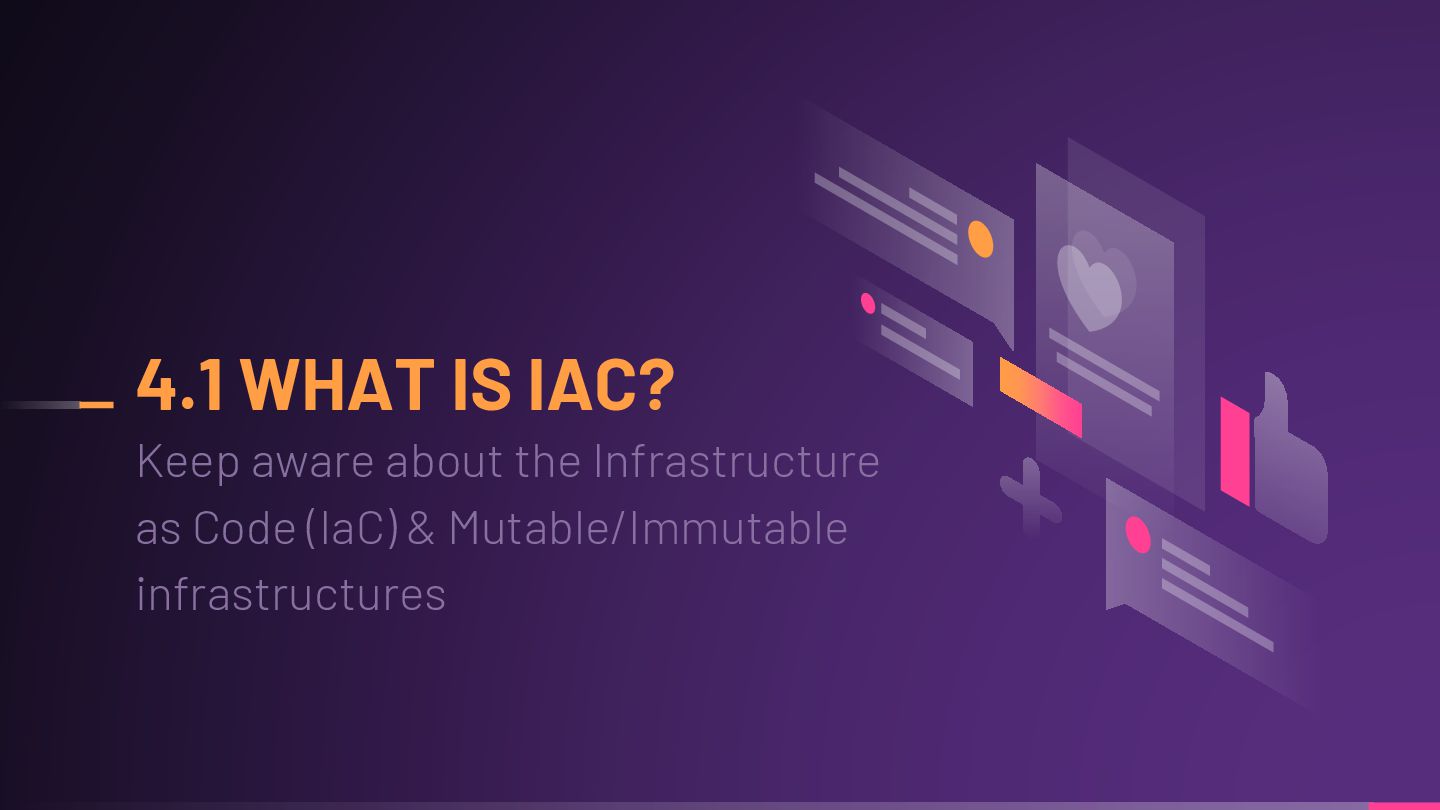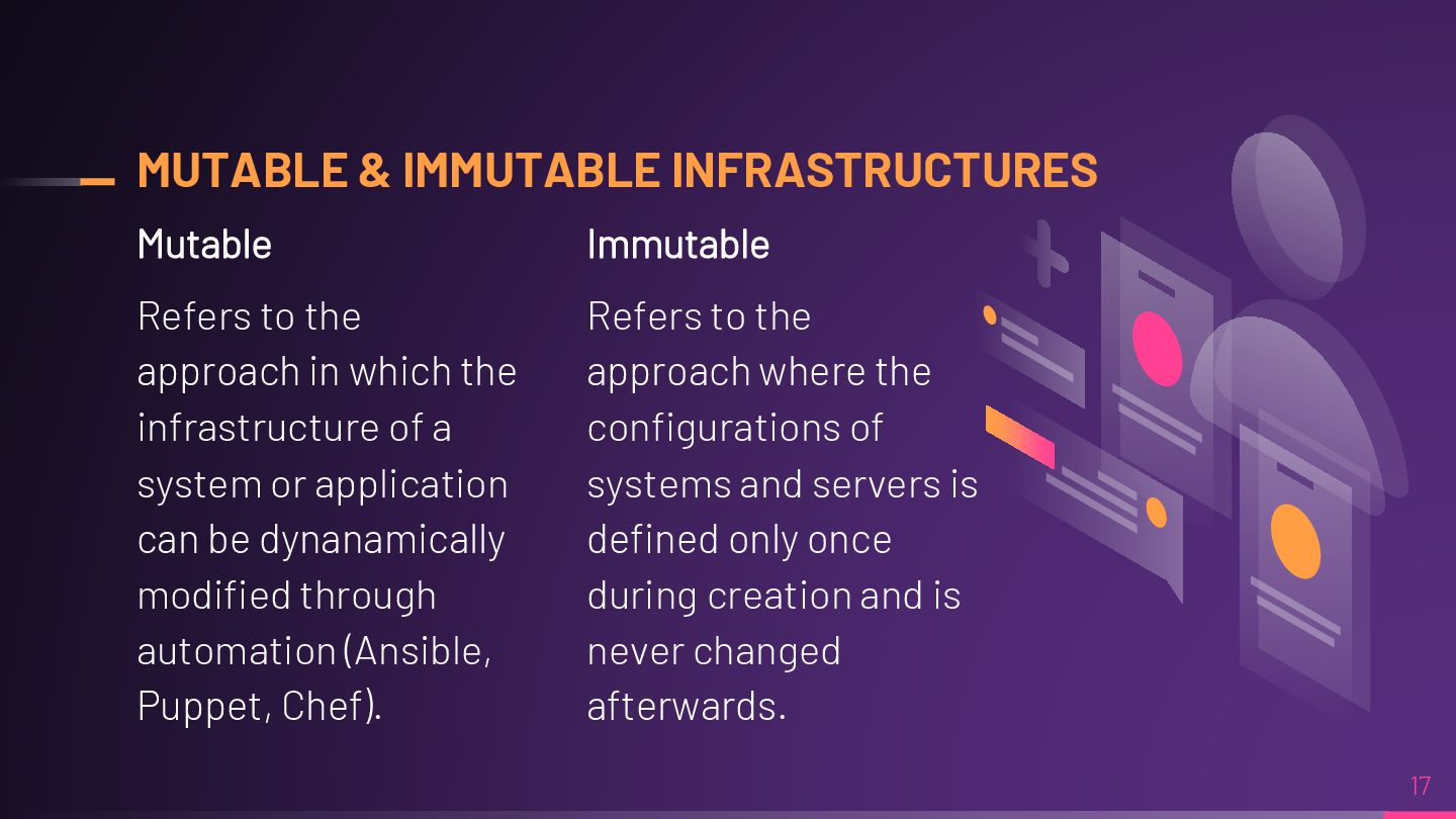 a system or application can be dynanamically modified through automation (Ansible, Puppet, Chef). MUTABLE & IMMUTABLE INFRASTRUCTURES Immutable Refers to the approach where the configurations of systems and servers is defined only once during creation and is never changed afterwards. 17