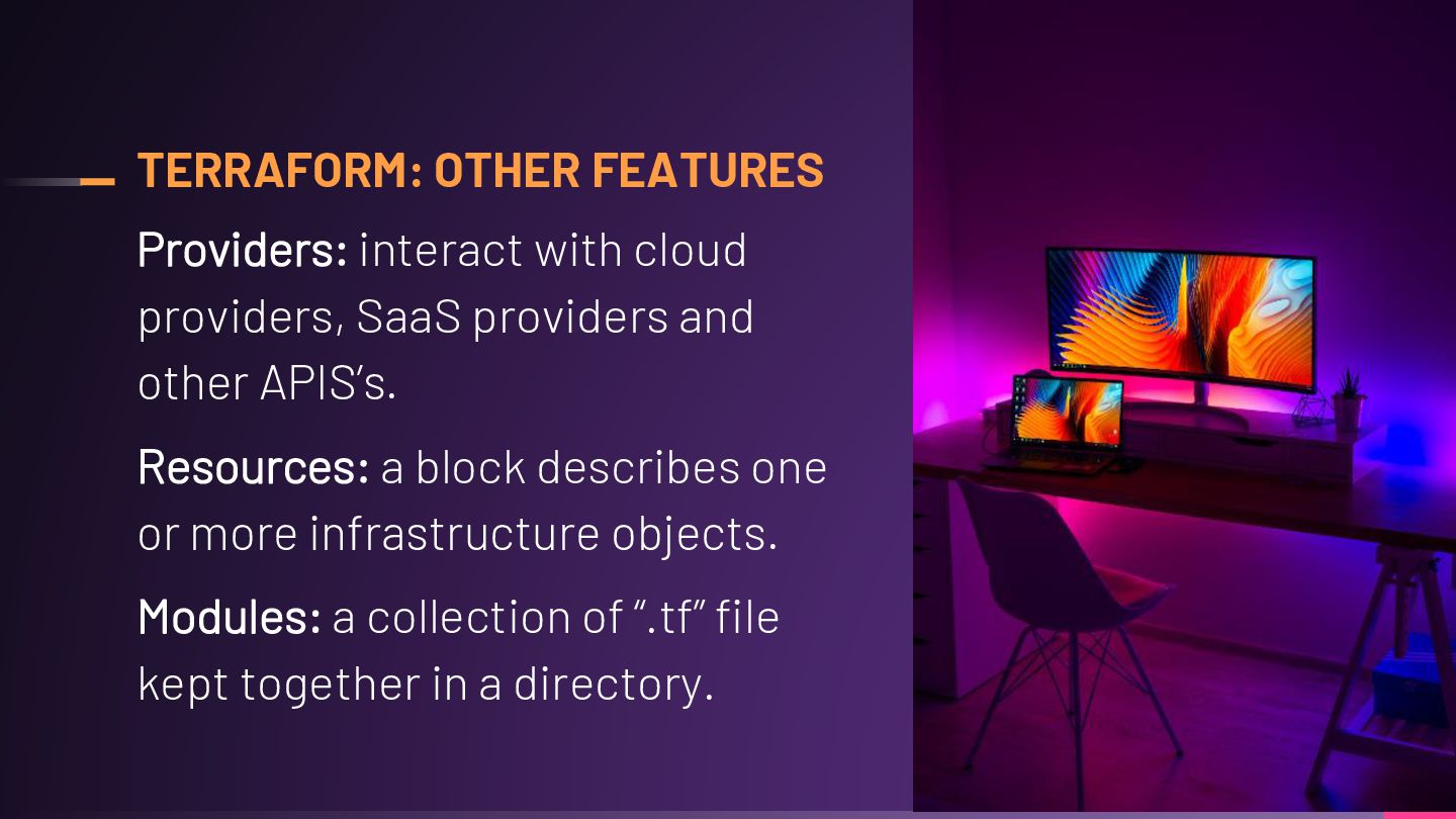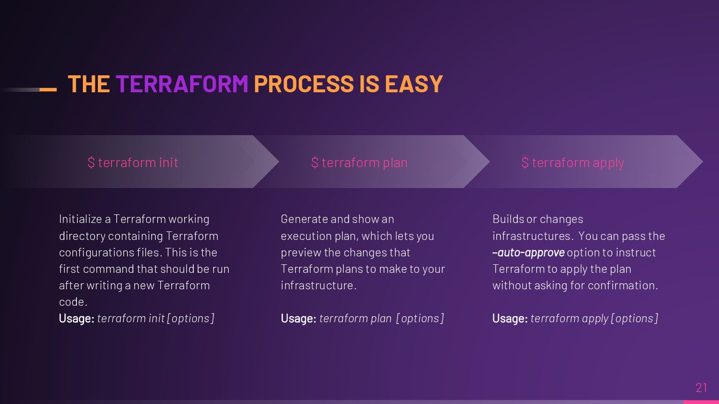 and other APIS’s. Resources: a block describes one or more infrastructure objects. Modules: a collection of “.tf” file kept together in a directory. 20