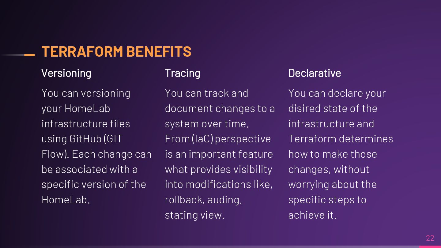 using GitHub (GIT Flow). Each change can be associated with a specific version of the HomeLab. Tracing You can track and document changes to a system over time. From (IaC) perspective is an important feature what provides visibility into modifications like, rollback, auding, stating view. Declarative You can declare your disired state of the infrastructure and Terraform determines how to make those changes, without worrying about the specific steps to achieve it. 22