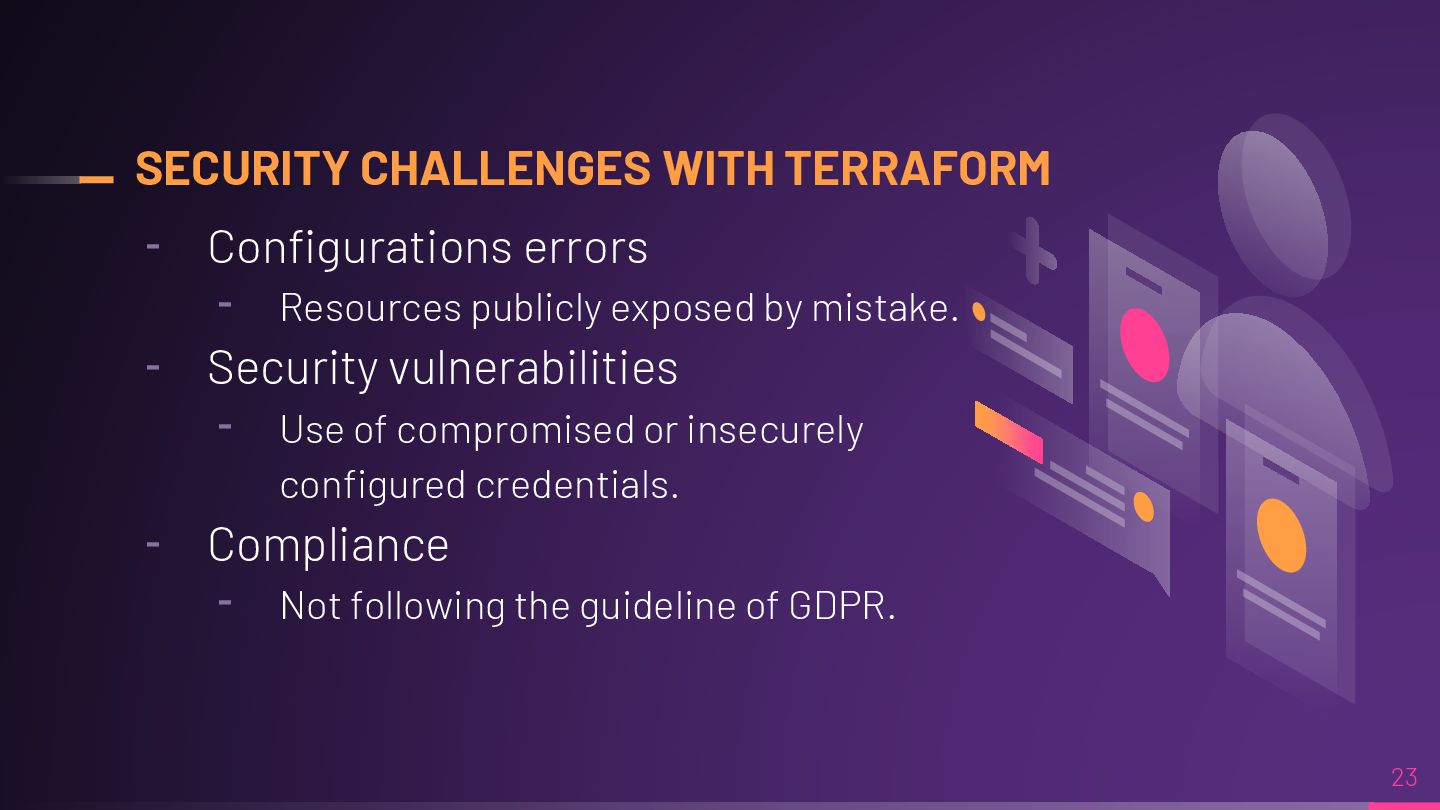 exposed by mistake. ╸ Security vulnerabilities ╸ Use of compromised or insecurely configured credentials. ╸ Compliance ╸ Not following the guideline of GDPR. 23