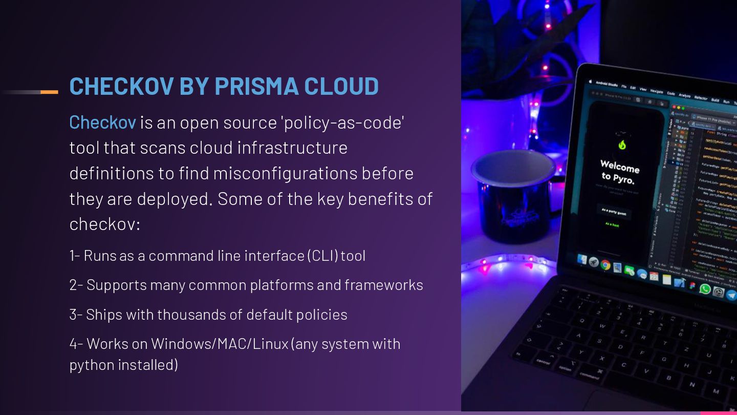tool that scans cloud infrastructure definitions to find misconfigurations before they are deployed. Some of the key benefits of checkov: 1- Runs as a command line interface (CLI) tool 2- Supports many common platforms and frameworks 3- Ships with thousands of default policies 4- Works on Windows/MAC/Linux (any system with python installed) 25