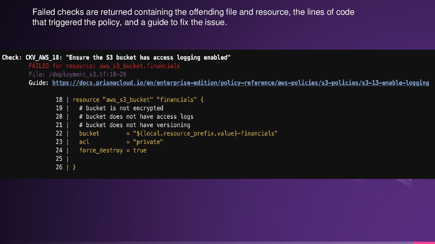 and enforce policies in many different ways. To highlight a few: 1. Scans can run on individual files or entire directories. 2. Policies can be selected through selection or omission. 3. Enforcement can be determined by flags that control checkov's exit code. 26