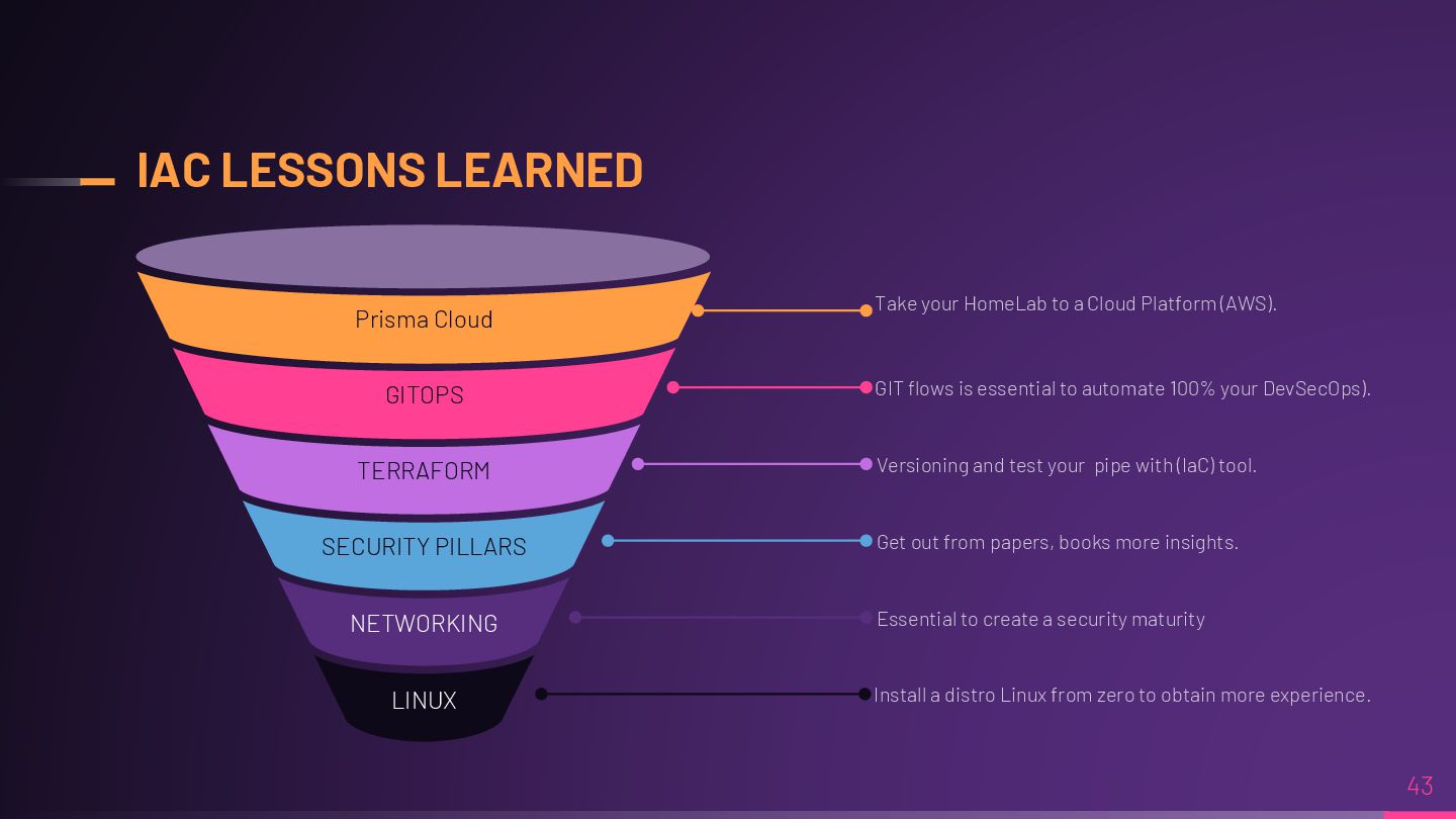 SECURITY PILLARS Take your HomeLab to a Cloud Platform (AWS). GIT flows is essential to automate 100% your DevSecOps). Versioning and test your pipe with (IaC) tool. Get out from papers, books more insights. Essential to create a security maturity Install a distro Linux from zero to obtain more experience.