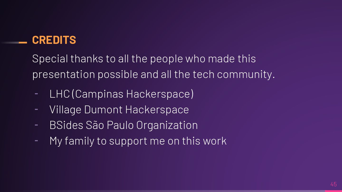 presentation possible and all the tech community. ╸ LHC (Campinas Hackerspace) ╸ Village Dumont Hackerspace ╸ BSides São Paulo Organization ╸ My family to support me on this work 45