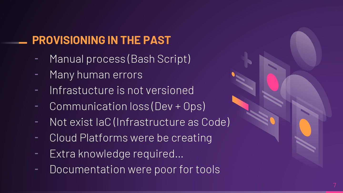 Many human errors ╸ Infrastucture is not versioned ╸ Communication loss (Dev + Ops) ╸ Not exist IaC (Infrastructure as Code) ╸ Cloud Platforms were be creating ╸ Extra knowledge required… ╸ Documentation were poor for tools 7