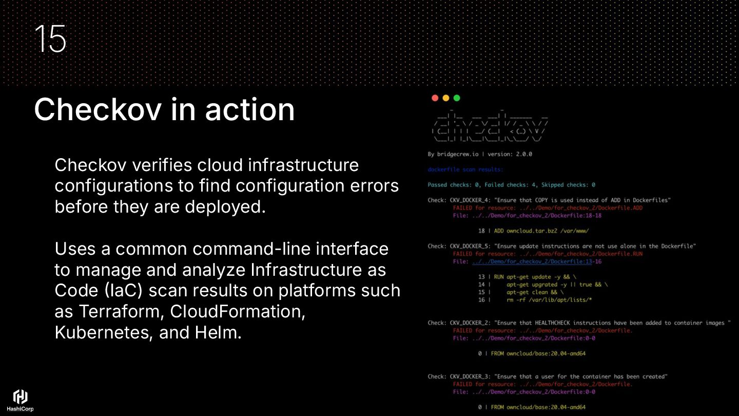 find configuration errors before they are deployed. Uses a common command-line interface to manage and analyze Infrastructure as Code IaC) scan results on platforms such as Terraform, CloudFormation, Kubernetes, and Helm. 15